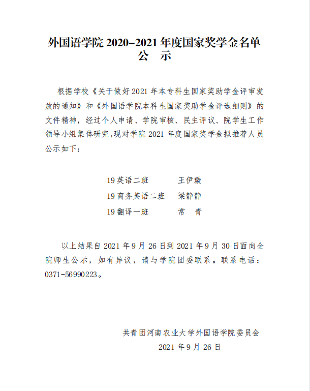 Bet365网址 2020-2021学年国家奖学金公示