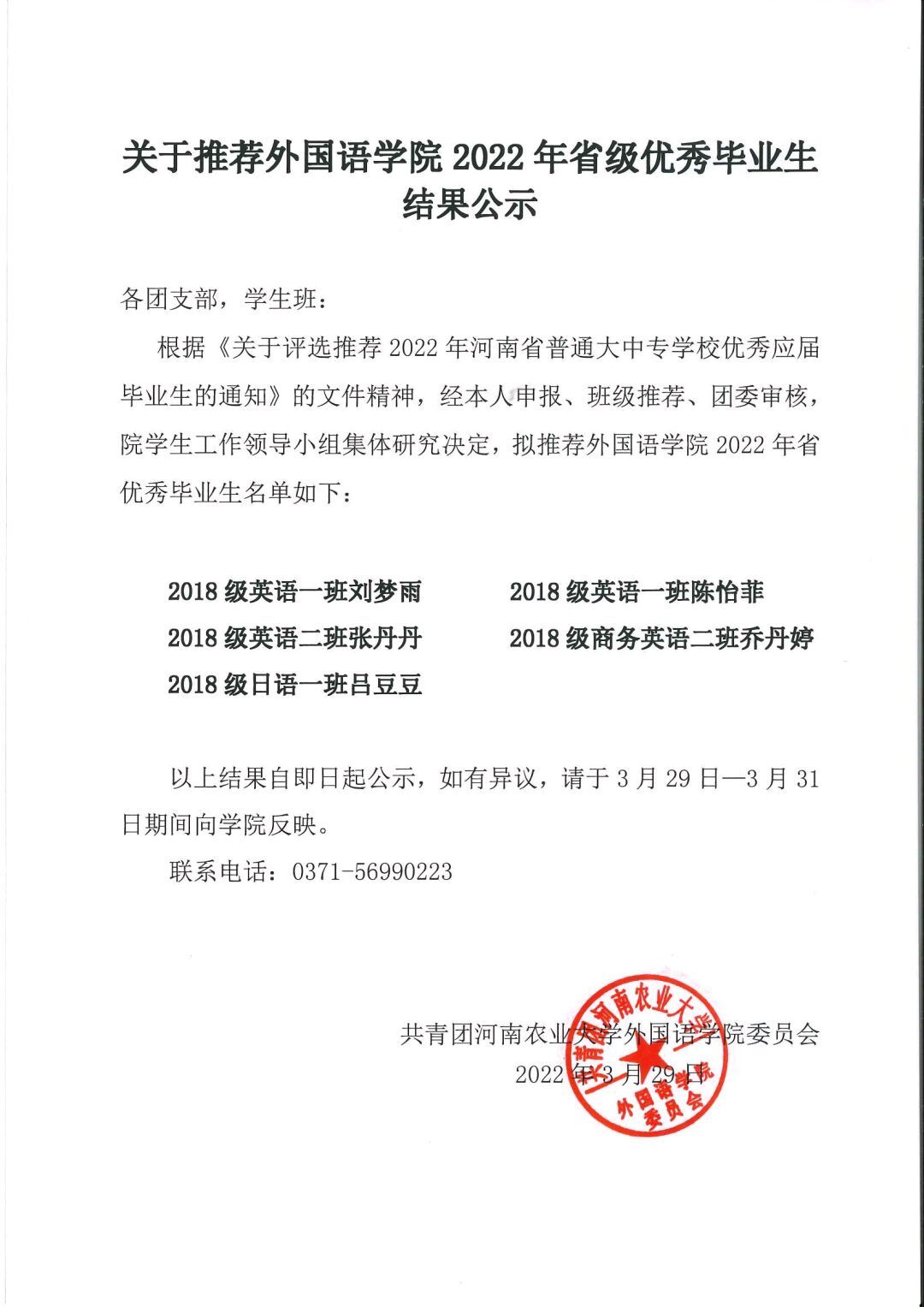 关于推荐Bet365网址 2022年省级优秀毕业生结果公示