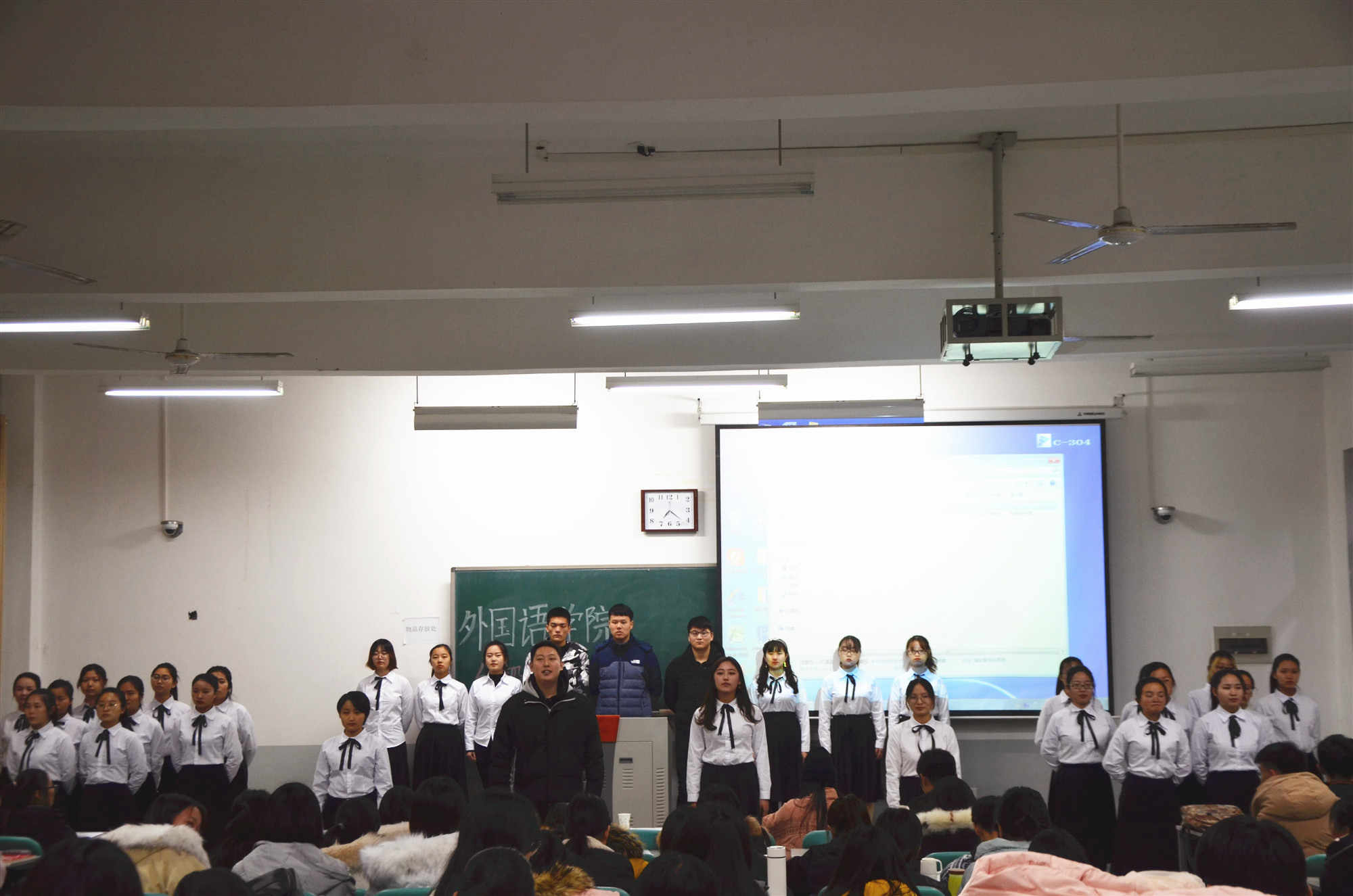 在主持人简要介绍本次活动规则后,风采展示正式拉开序幕。各团支部以才艺展示为载体,通过多媒体演示,将班级特色与红船精神融为一体,以小见大,将改革开放40年来的艰辛旅程和伟大成果生动地展现在观众面前。首先进行风采展示的是17级英语一班,伴着多样化的PPT展示,他们一个个目光坚定、昂首挺胸地走进会场。打竹板,敲击的是心跳;做手语,比划的是温情。挥舞彩旗飘,澎湃音符跳,他们将祖国歌唱,把红船赞扬。17级英语四班用新颖的短剧形式,将改革开放40年的沧桑巨变浓缩其中,节奏轻松活泼却又不失厚重之感。行云流水、刚劲有力的“厉害了,我的国”书法作品更是将他们“与祖国同行,铸华夏辉煌!”的拳拳爱国之心淋漓尽致的展现出来。各团支部把满腔热血融进才艺表演中,或低吟浅唱倾诉对祖国的热爱与期盼,或以慷慨激昂的朗诵将中华民族发愤图强、不屈不挠、百折不回的伟大精神高声歌颂。