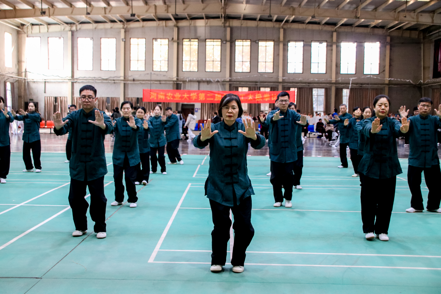 教职工身着统一青蓝色上衣,喊着“爱我农大,振兴中华”的响亮口号,踏着整齐的步伐,气宇轩昂地走向赛场中心。伴随着悠扬的音乐,缓缓起势,他们的动作以匀求活,以慢生柔,刚柔并济。一招一式,一张一弛,出拳如行云流水,轻松自然,把太极拳的精髓演绎得淋漓尽致,充分展现了太极拳的柔和之美。最终,在全体参赛教职工的共同努力下,Bet365中文网址