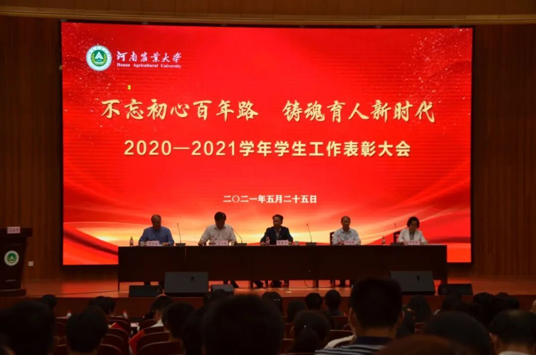 本网讯(审稿:陈桃 供稿:黄湘)5月25日晚七点,河南农业大学在龙子湖校区图书馆一楼报告厅举行了“不忘初心百年路,铸魂育人新时代”2020-2021学年学生工作表彰大会。校党委书记魏蒙关、校长介晓磊等领导班子成员出席会议。Bet365中文网址 师生代表参加表彰大会。会议由校党委副书记、工会主席李成吾主持。