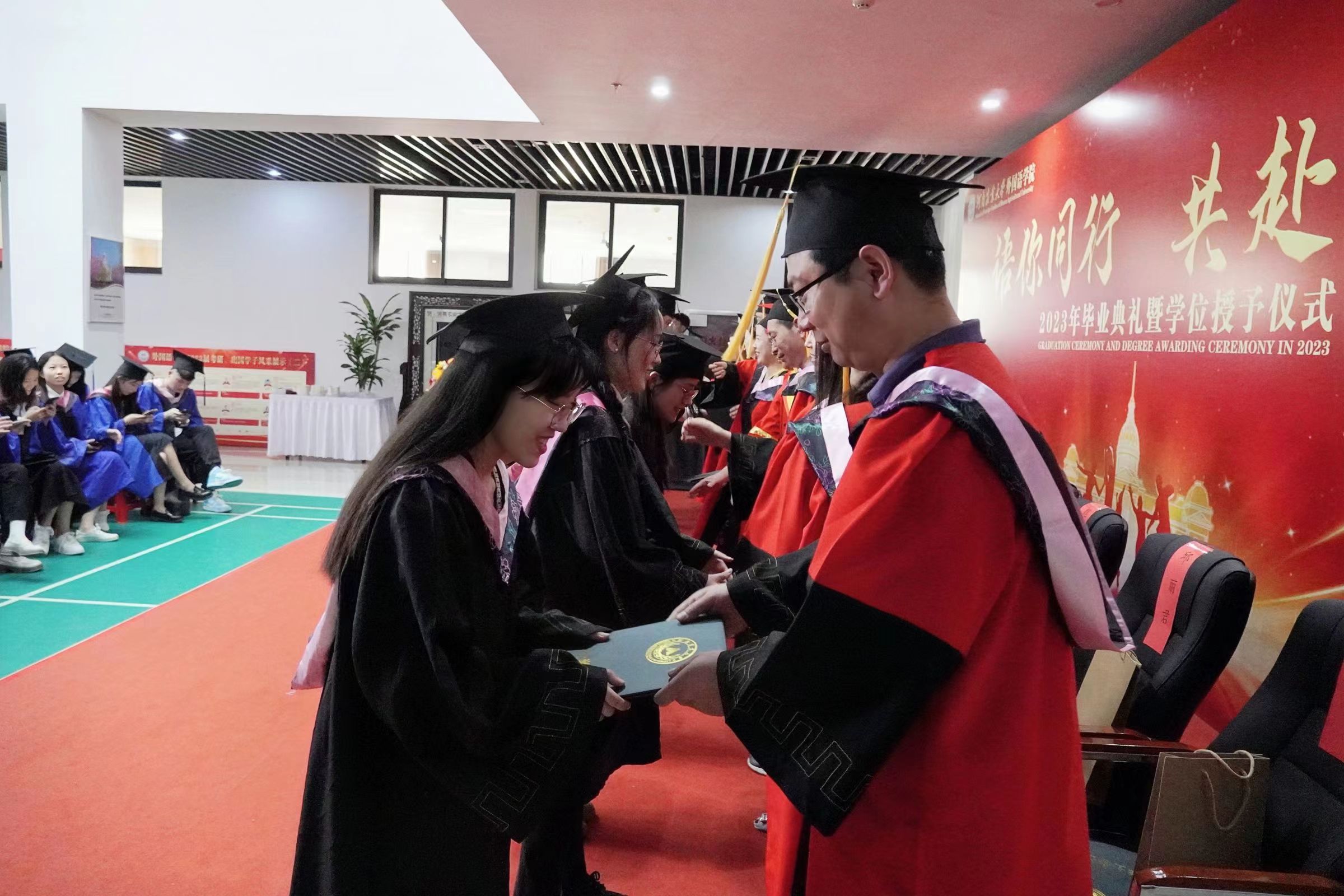 在欢快的乐曲声中,院长、院学位评定委员会主席张俊杰教授为硕士学位获得者一一拨正流苏,颁发学位证书,院领导和院学位评定委员会委员共同为2023届本科毕业生拨正流苏、颁发学位证书。