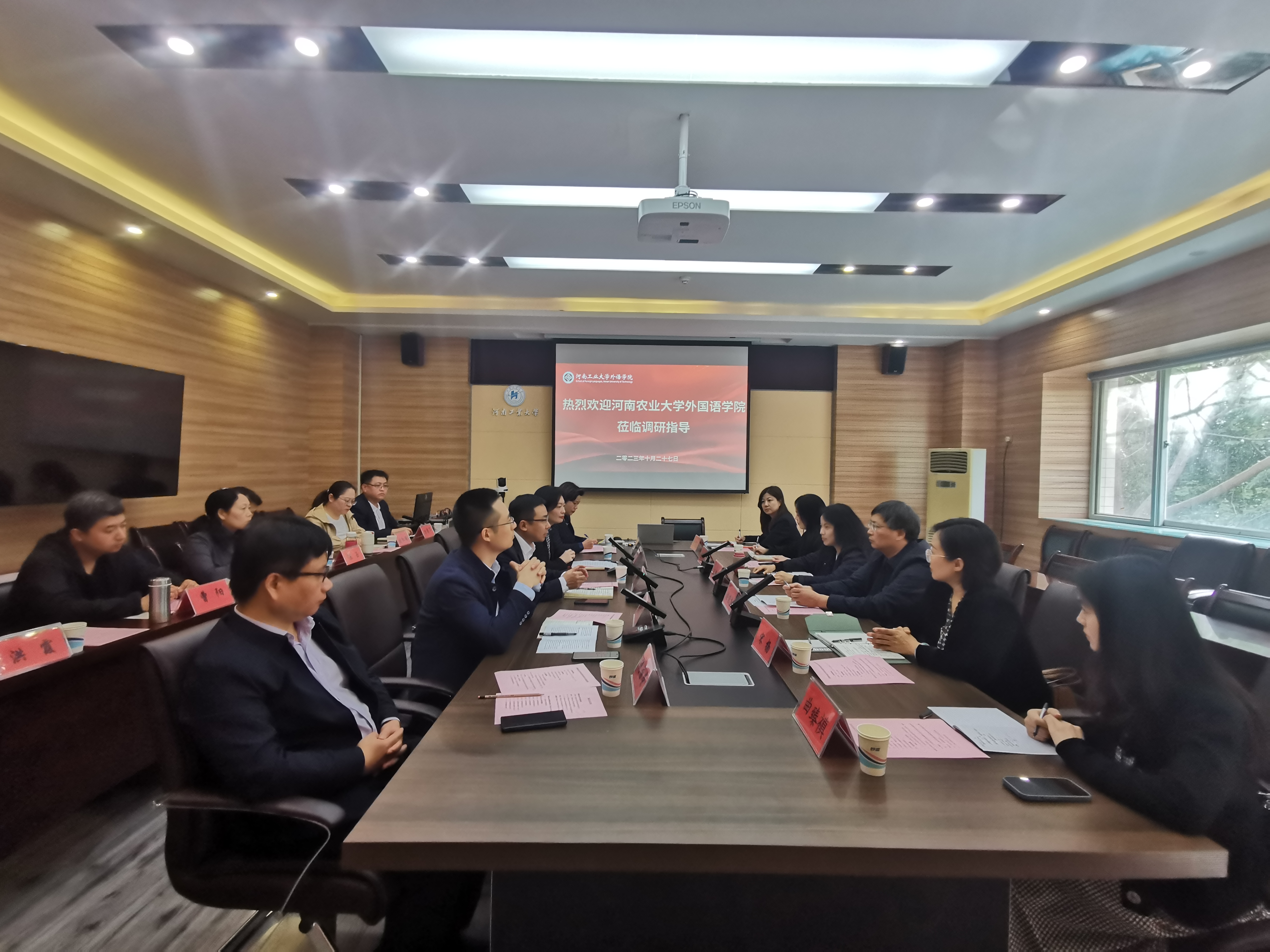 本网讯(审稿人 王燕萍 供稿人 郝晓峰 刘佳)为加强交流合作,推动Bet365网址 事业综合发展,10月27日上午,院党委书记王燕萍、院长张俊杰一行赴河南工业大学外语Bet365网址 调研交流。河南工业大学外语Bet365网址 党委书记王云涛及相关领导和教师参加了活动。