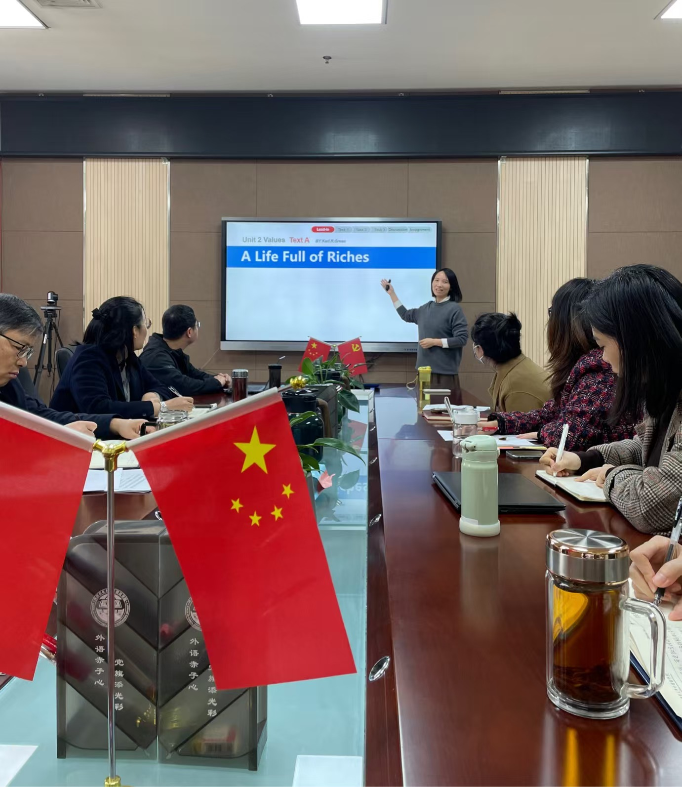 随后,马瑶以《大学英语》的一篇文章A Life Full of Riches为授课内容,开始教学示范。凭借着扎实的专业功底、娴熟的教学技巧和极有感染力的表情和肢体语言,马瑶为大家呈现了一场教学盛宴。她深挖文章主题,积极引导参会的教师代表与其问答互动,结合众多论据层层深入地探讨了本文中富有(Riches)的意义,即物质的富足并不是人生充实的要件,精神的富有才是。紧接着,马瑶引入了《论语》中孔子对其弟子颜回的高度评价,盛赞了颜回安贫乐道的人生态度,中西文化在至高的精神追求上遥相呼应,非常自然流畅地切入价值观的引导和思政教育。鲜活的实例、巧妙的融入,让参会教师大呼精彩!