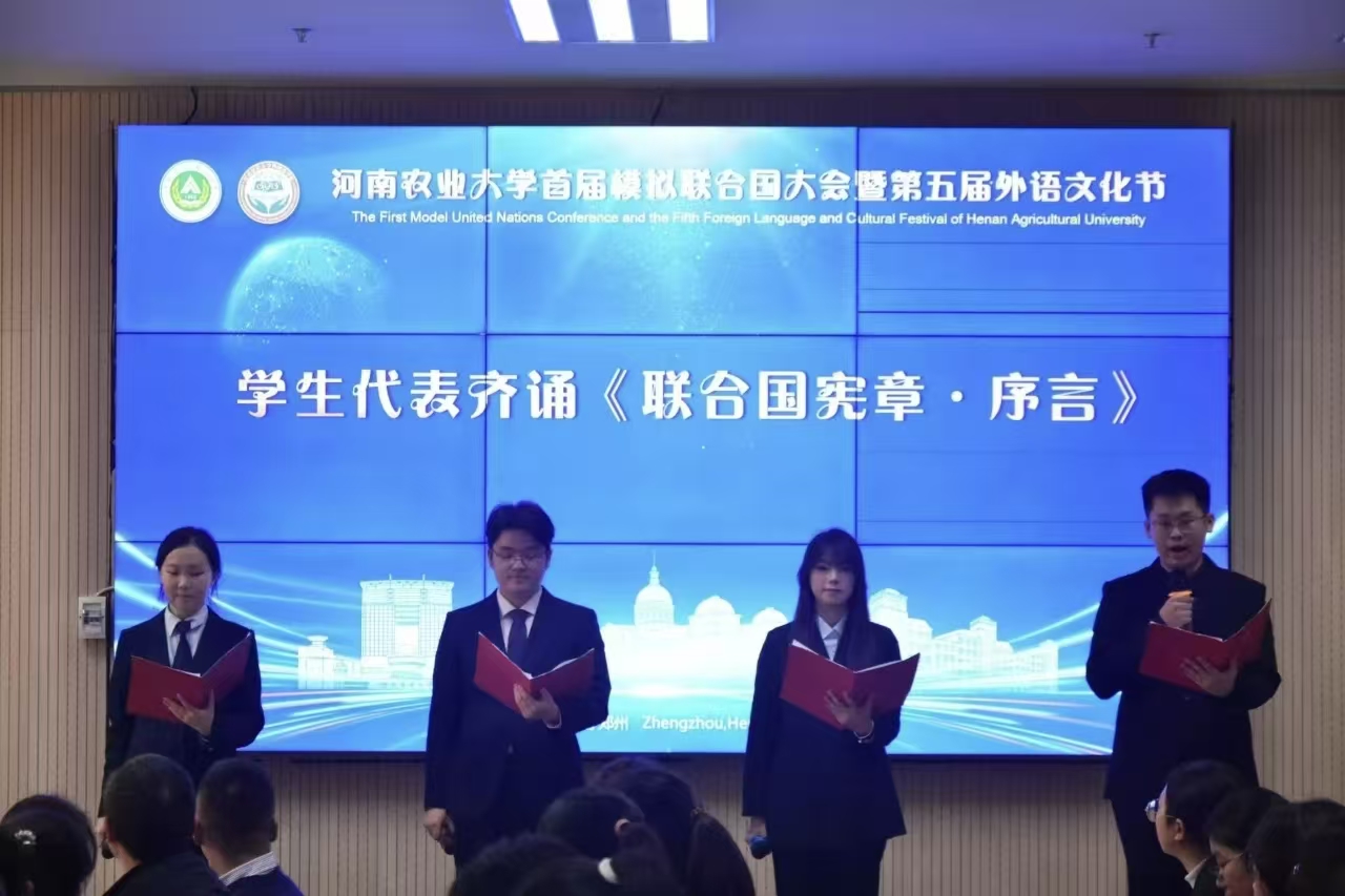 于繁塔楼A324隆重举行“河南农业大学首届模拟联合国大会暨第五届外语文化节”。校党委副书记、工会主席邹松涛、校党委学生工作部部长徐峰、校团委书记雷雯、研究生工作部部长郭治鹏、郑州大学外国语与国际关系Bet365网址
