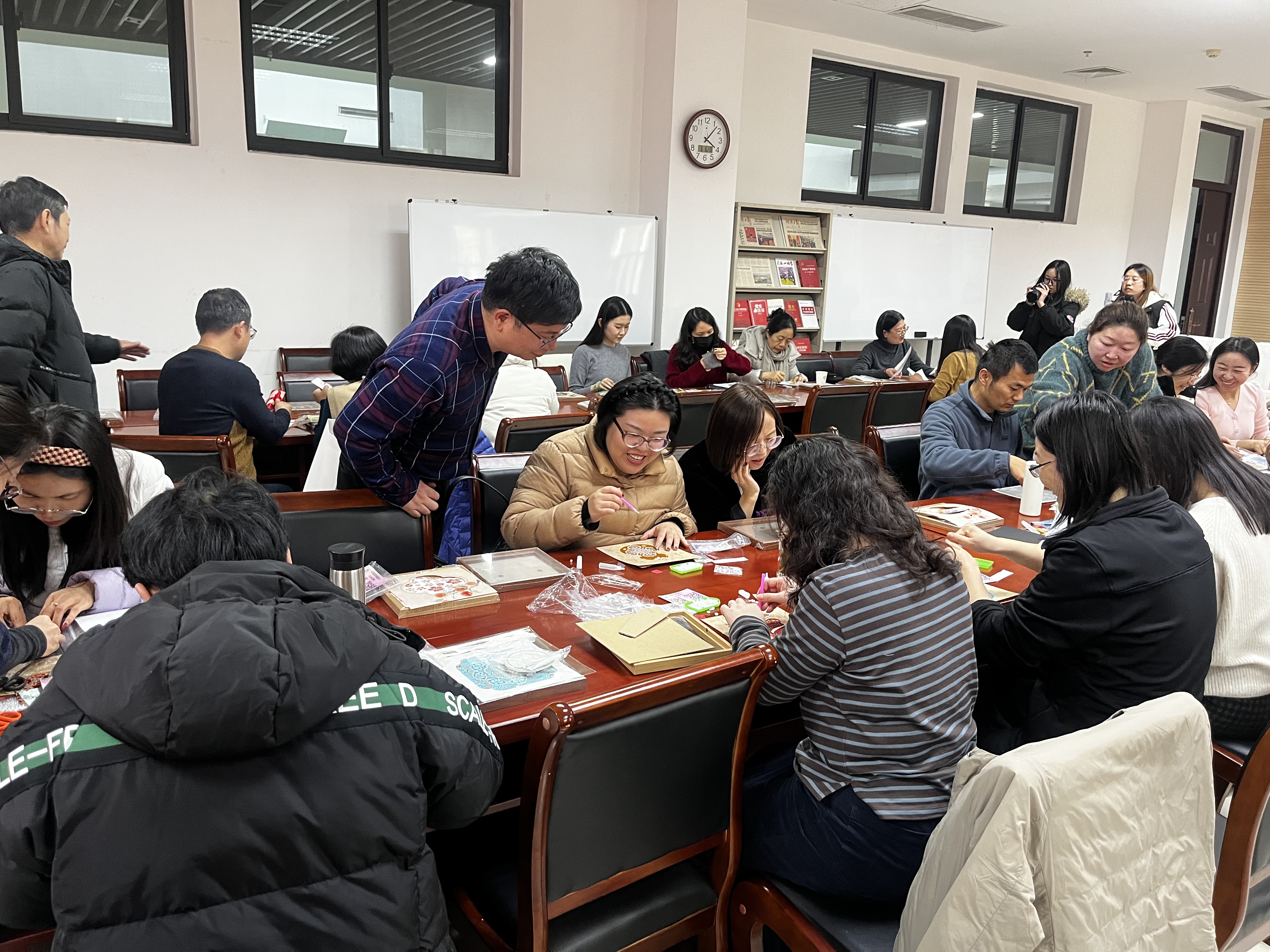 活动伊始,手工老师围绕宋锦的历史渊源、织造工艺与文化内涵进行讲解,让大家领略“一寸宋锦一寸金”的非遗魅力。在手工创作环节,老师们以锦为底、以珠为墨,在指导下细心构图、精准粘贴,将温润珍珠与雅致宋锦巧妙融合,一针一粘、一珠一锦间尽显匠心巧思。现场氛围温馨融洽,欢声笑语不断,平日里深耕教学一线的教育工作者们,化身巧手匠人,沉浸式体验传统手工艺的乐趣。