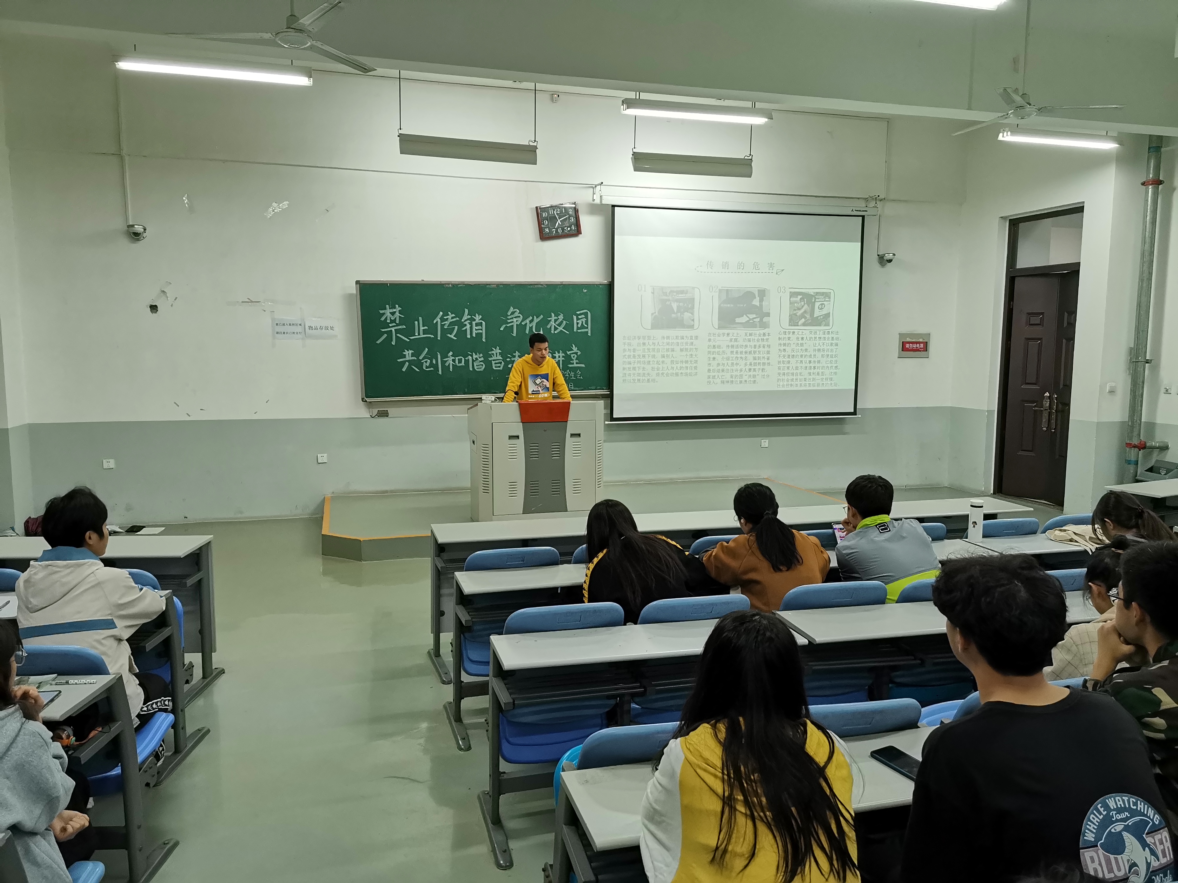 讲座伊始,负责人首先向大家阐释了“何为传销”,并为大家详细的讲述了传销的来源及发展,帮助大家理清了直销和传销的区别,让同学们对传销有了基本的认识;随后,他结合校园实例深入剖析了传销的实质,向大家揭露了传销的主要骗术,使大家对传销活动的鉴别能力有了进一步提高;接着,吴名团从社会学、心理学、经济学三个方面让大家深刻了解到了传销对于个人和社会的危害,为同学们敲响了警钟;最后他强调,大学生虽然有较高的专业文化知识水平,但社会实践经验相对不足,防范不法侵犯行为的能力比较弱,相对容易误入传销陷阱。因此,他呼吁学生要时刻保持清醒头脑,在应对传销时要懂得利用技巧,及时求助国家相关执法机构等。此外,他希望各班班委切实负起责任,及时关注班级同学动向,及时上报异常情况,保证班级同学的人身、财产安全,共建安全校园。