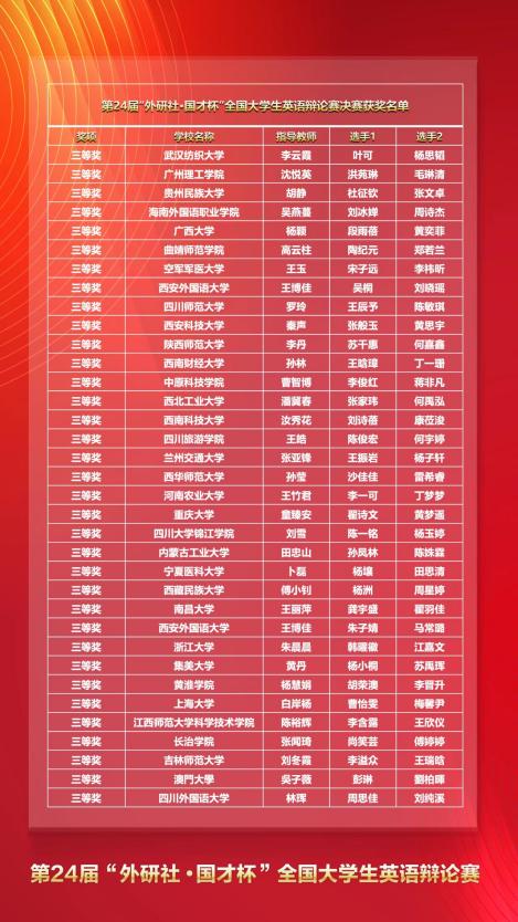 宋扬、王竹君、朱婧三位老师的指导下,2019级翻译二班学生丁梦梦、李一可脱颖而出,获得全国三等奖。此前,在2022年4月16-17日的华西地区复赛中,两位选手完成了5轮紧张密集的比赛,成功晋级全国总决赛。