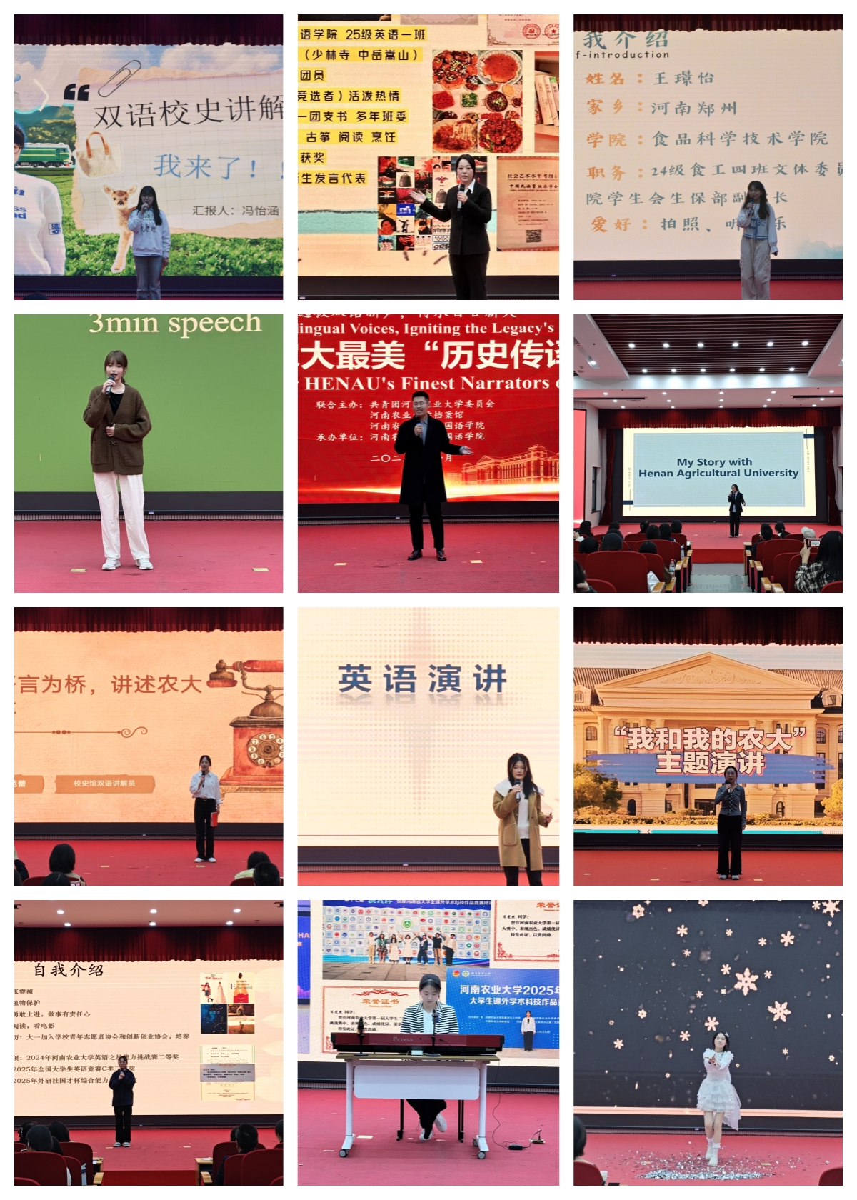 本次赛事共吸引来自全校的100余名选手报名参赛,经过视频预赛、现场初赛等多轮选拔,来自6个Bet365网址 的12名选手入围决赛。决赛共分为中文个性化自我介绍、“我和我的农大”英文主题演讲、才艺展示三个环节。选手们结合PPT、短视频,生动展示自身特色;中英文流畅表达与饱满的情感打动在场观众;钢琴弹唱、舞蹈、配音秀、脱口秀等形式轮番上演,精彩表现让观众席传来阵阵喝彩。