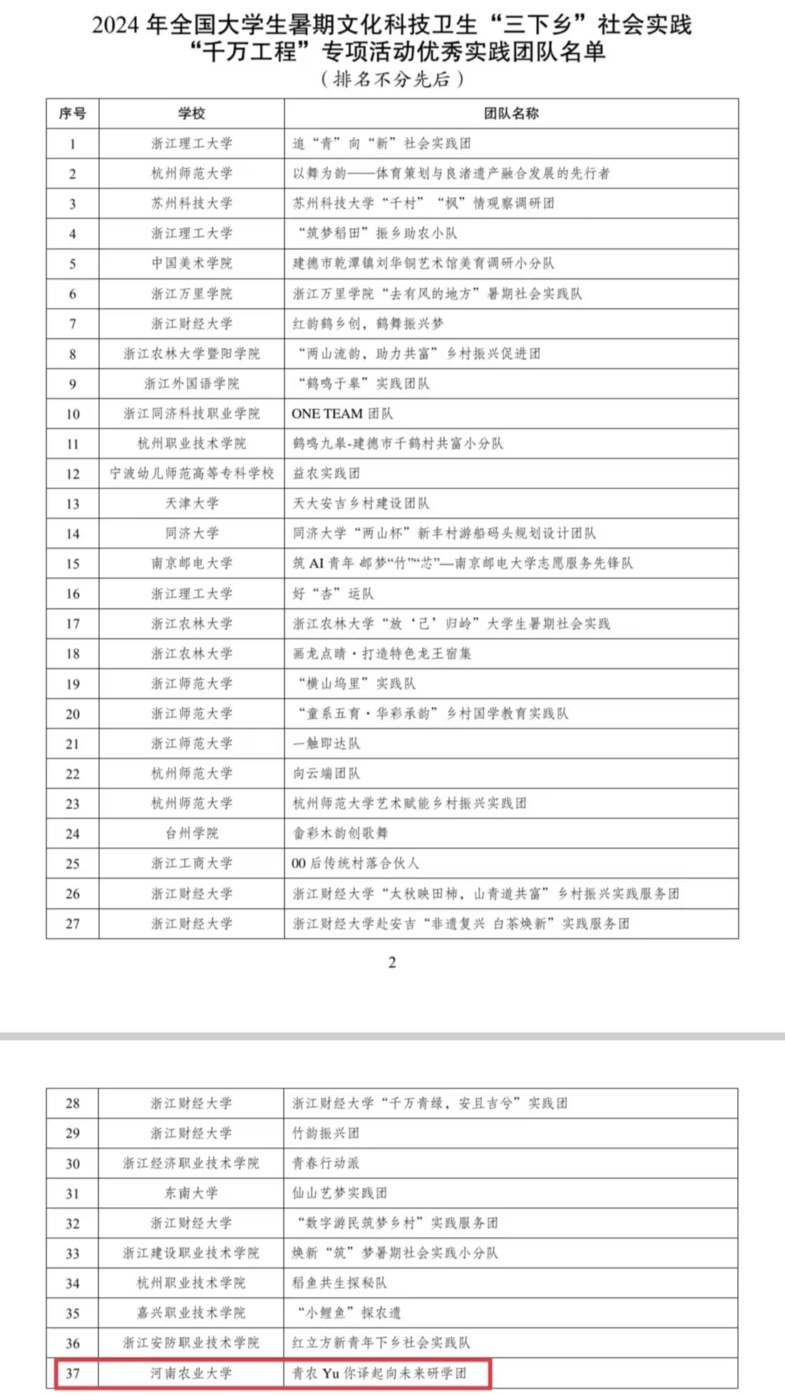 本网讯(审稿:杨鑫 供稿:冯超 杨若晴)近日,2024年全国大学生暑期文化科技卫生“三下乡”社会实践“千万工程”专项活动优秀实践团队名单公布,Bet365中文网址 青农Yu你译起向未来研学团荣获优秀实践团队。