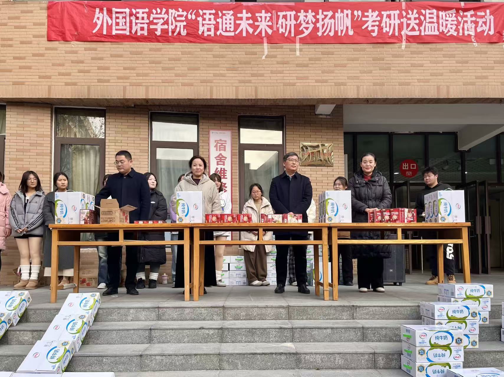 向全体考研学子表达了最真挚的祝福,对同学们勤奋备考、追求梦想的精神给予高度的赞扬与肯定,并鼓励同学们合理规划时间和进度,做到劳逸结合,保持平稳的心态,以饱满的精神状态迎接最后的考试,全力以赴地完成考研战场最后的“一公里”。院领导为所有考研学子送上了精心准备的牛奶和咖啡,祝愿外语学子“牛”气冲天、突“啡”猛进、一战成硕。