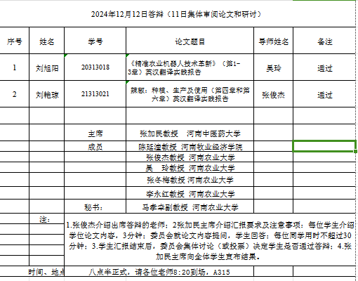 本网讯(审稿:吴玲 供稿:马孝幸)12月12日,Bet365中文网址 组织开展了2024届下半年翻译硕士学位论文答辩工作。本次答辩会特邀河南中医药大学张加民教授担任答辩委员会主席,河南牧业经济Bet365网址 陈延潼教授和Bet365中文网址 部分硕士生导师担任答辩委员,2024届下半年2名硕士研究生参加本次答辩。