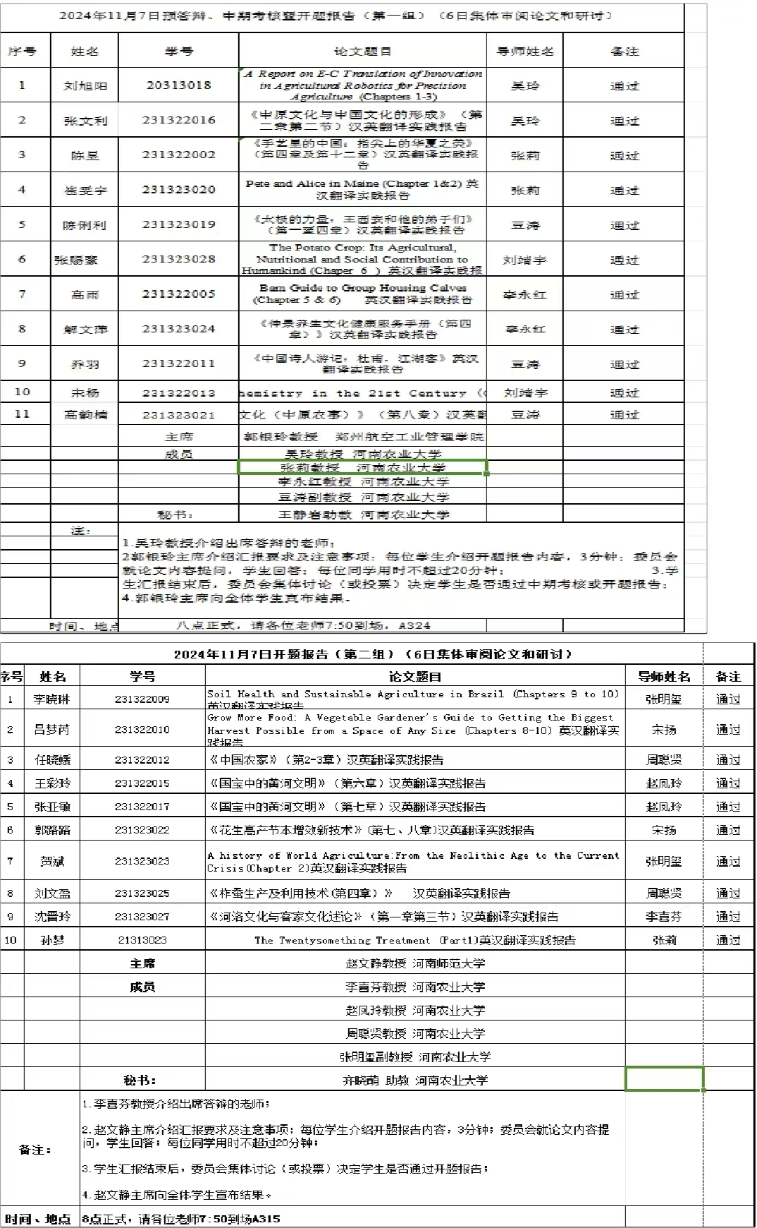 本网讯(审稿:吴 玲 ;供稿:马孝幸;摄影:马孝幸 齐晓萌 王静岩)11月6-7日,Bet365中文网址 组织开展了2024年英语笔译专业研究生学位论文开题报告及预答辩、中期考核论证会。本次论证会特邀河南师范大学赵文静教授、河南财经政法大学孙建华教授和郑州航空工业管理Bet365网址 郭银玲教授分别担任论证小组主席,Bet365中文网址 硕士生导师担任委员,2名研究生参加预答辩、中期考核和29名23级研究生参加开题答辩;24级研究生旁听了此次论证会。