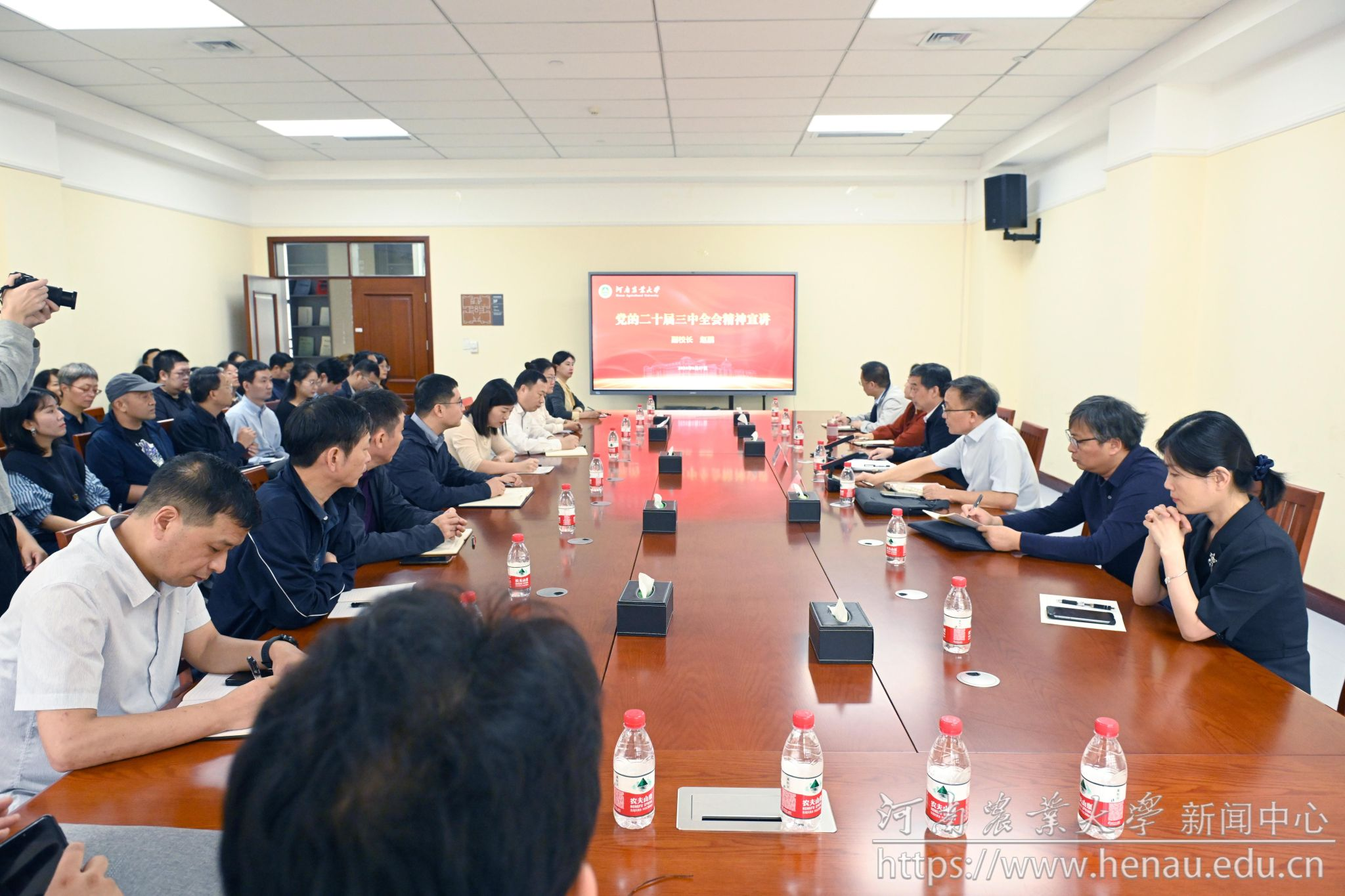 宣讲会上,赵鹏以“进一步全面深化改革,推进中国式现代化”为题,从深入学习领会习近平总书记在党的二十届三中全会上的重要讲话精神、学习贯彻习近平总书记在全国教育大会上的重要讲话精神、学校当前的形势与任务三个方面展开宣讲,深入浅出,高屋建瓴,特别是结合分管工作,从学校深化与中国农业科Bet365网址 融合发展、推动教育教学改革、促进科教融汇、实现更高质量的产教融合等方面,与老师们进行面对面的交流与分享,为下一步如何提高本科教育教学质量指明了方向、提升了认知、启发了思想。