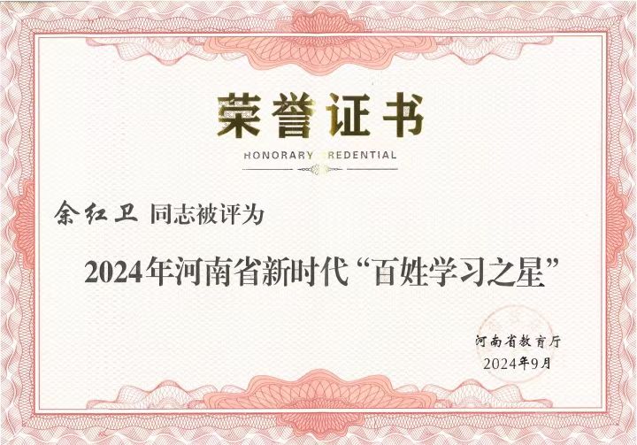 本网讯(通讯员 张德欣)日前,河南省教育厅发布了《河南省教育厅办公室关于公布2024年河南省新时代“百姓学习之星”“终身学习品牌项目”名单的通知》,Bet365中文网址 教师余红卫获2024年河南省新时代“百姓学习之星”荣誉称号。