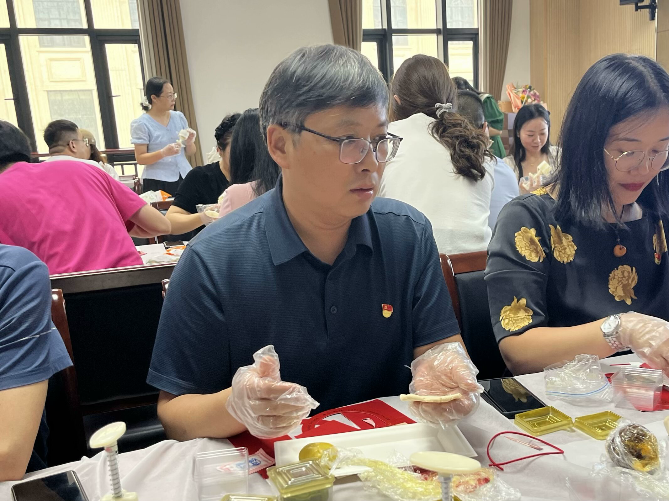 活动现场,大家欢聚一堂,通过和面、揉馅、裹皮到模具压花,再到包装等一系列流程还原月饼的完整制作过程。全体教职工认真学习制作月饼的步骤和技巧,分工协作,配合默契,一块块精致特色的“外语印象艺术月饼”在他们手中诞生,大家纷纷拿出手机拍照留念,记录这个幸福时刻并互相分享彼此的劳动成果。