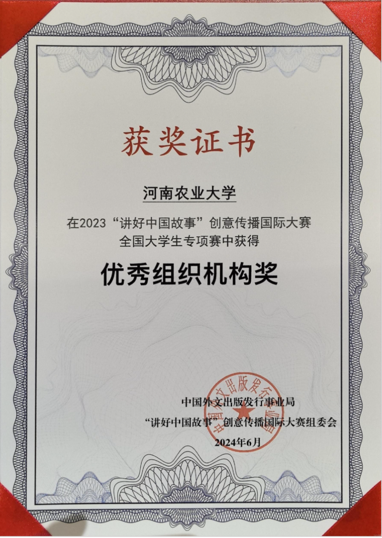 本次大赛由中国外文局主办,当代中国与世界研究院、中国互联网Bet365网址-Bet365中文网址、北京第二Bet365网址 承办,旨在鼓励全球青年以新颖独特的视角讲述中国故事,增进世界对中国文化的理解与认同。本次大赛参赛人数超过五千人,共收到参赛作品1424件,全球参与高校达到164所,涉及57个国家和地区,其中包括北京大学、清华大学、中国传媒大学、中国人民大学等近百所国家重点高校。参赛作品涉及中国历史故事、典型人物报道、非遗传承技艺、城市文化展示、新农村建设等众多领域,竞争异常激烈。河南农业大学凭借精心的组织、学生广泛的参与,赢得评委组高度评价,荣获全国“优秀组织机构奖”。