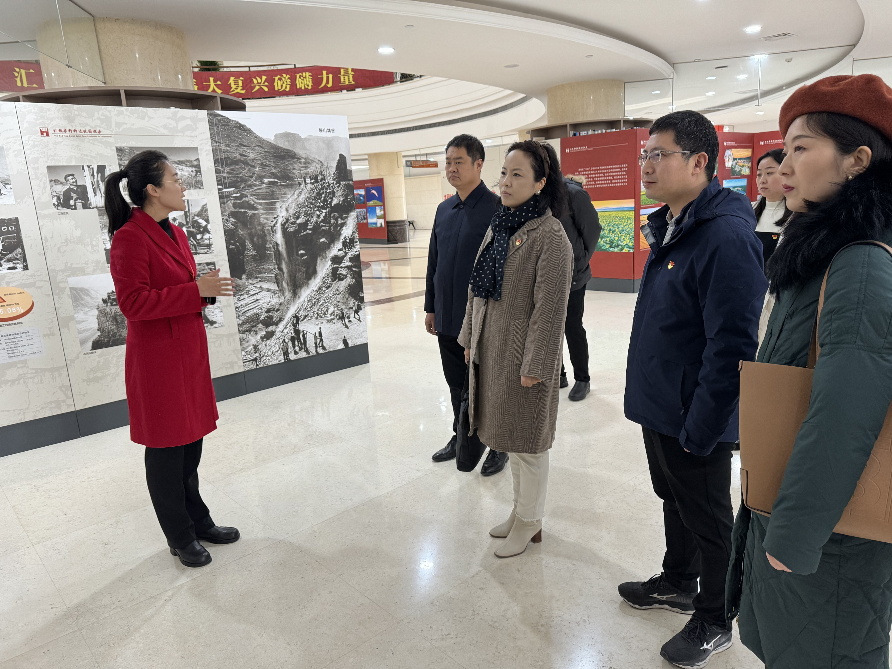 本网讯(审稿:王启佩 供稿:冯超 许菲)为深入学习宣传贯彻习近平新时代中国特色社会主义思想和党的二十大精神,弘扬革命精神,赓续红色血脉。12月1日,Bet365网址 党委书记王燕萍携院领导班子成员、大学生创新创业青年导师工作室教师代表、学生代表参观“红旗渠精神进校园巡展”。
