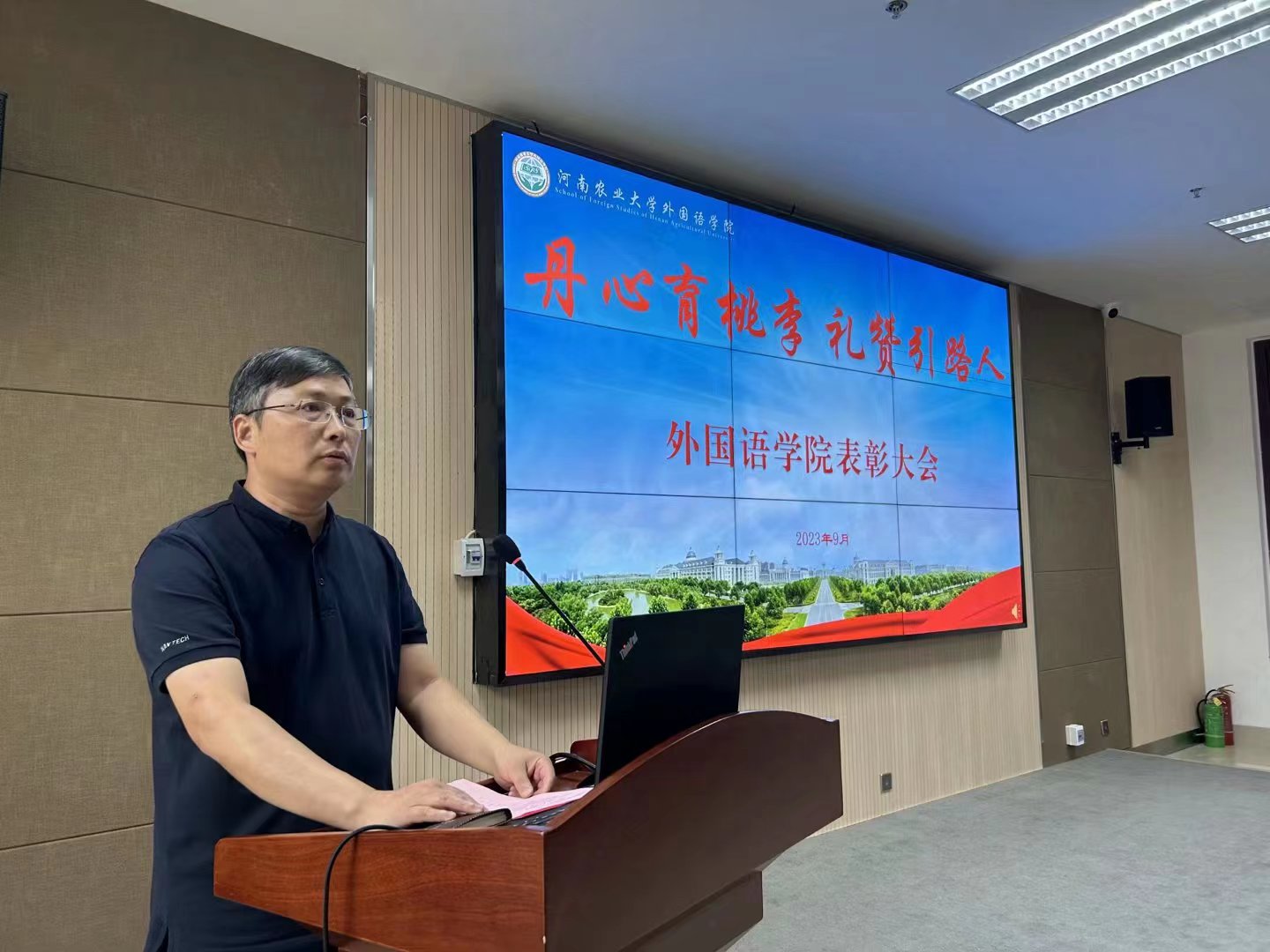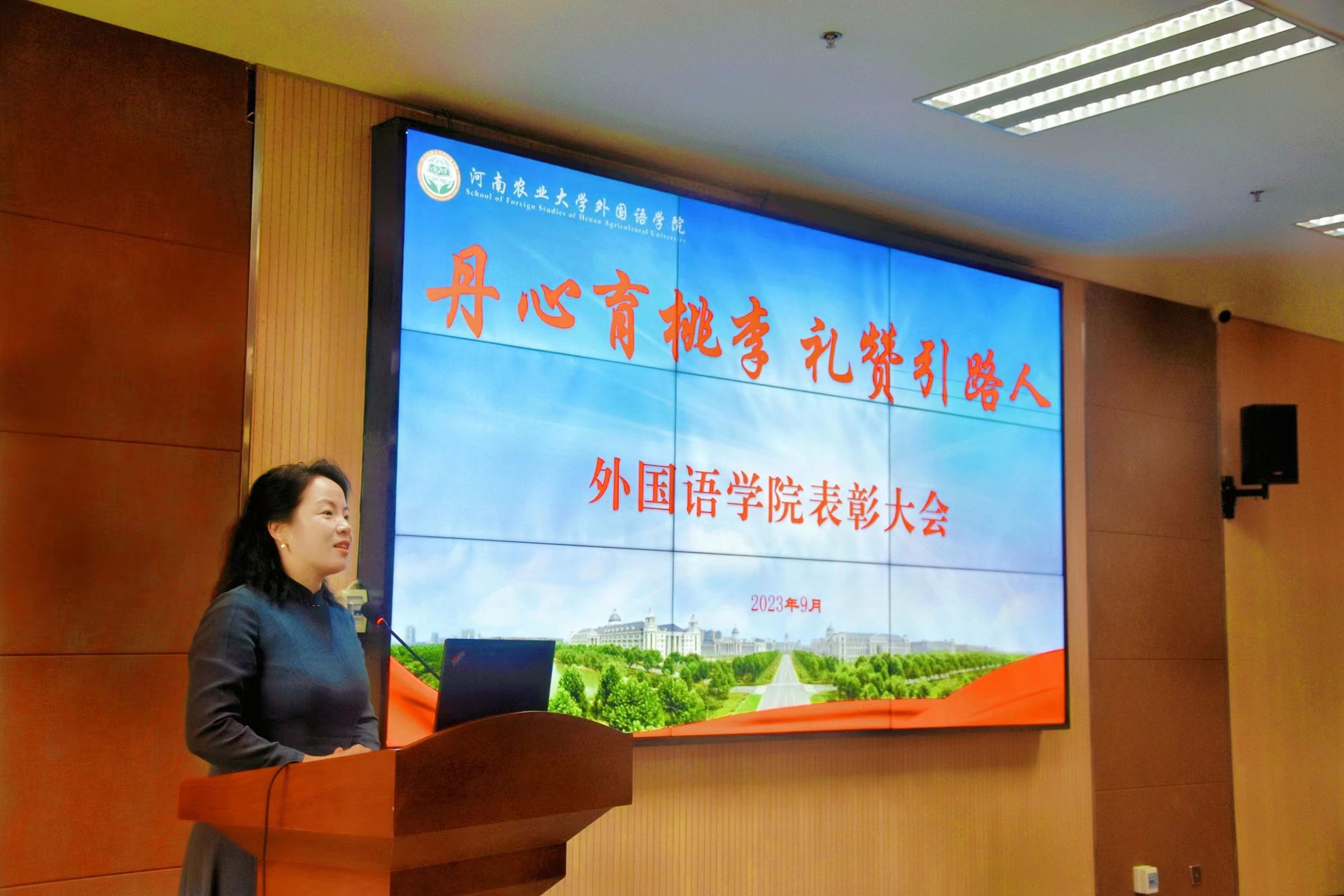 院长张俊杰宣读了获得“出彩河南人”2023年最美教师、河南省文明教师、河南省教学技能大赛一等奖、“翻译河南工程”优秀成果奖,校巾帼标兵、优秀教师、优秀班主任、十佳辅导员等省级、校级荣誉教师名单。副院长张卫东宣读了Bet365网址