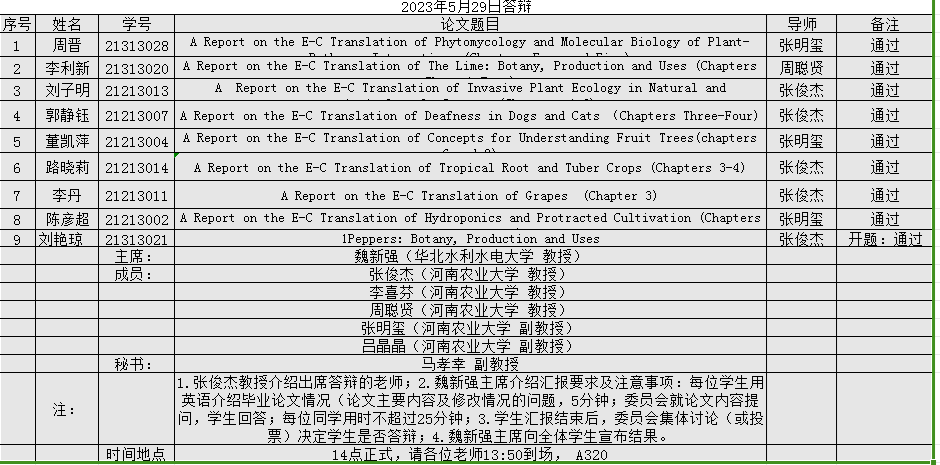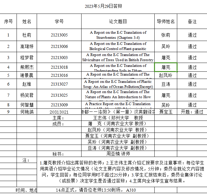 本网讯(审稿:张俊杰 供稿:马孝幸)5月29日,Bet365中文网址 组织开展了2023届翻译硕士论文答辩工作。本次答辩会特邀郑州大学外国语与国际关系Bet365网址 王志伟教授、华北水利水电大学魏新强教授、郑州航空工业管理Bet365网址 郭银铃教授担任三个答辩小组主席,Bet365中文网址 全体硕士生导师担任答辩委员,2023届硕士研究生参加本次答辩,2022级硕士研究生同时参与观摩。
