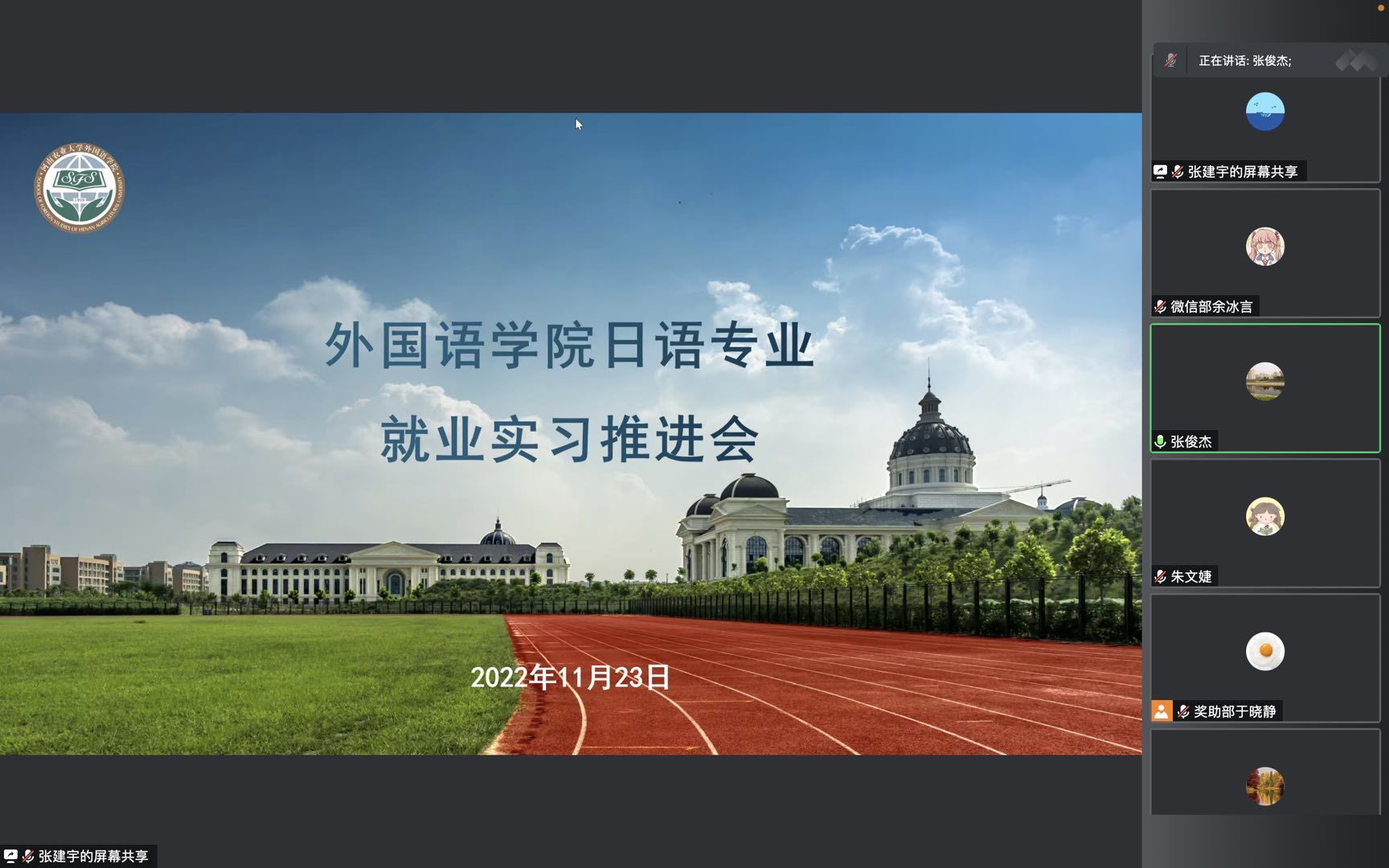 召开日语专业实习就推进会,院长张俊杰出席会议,校友企业词源教育公司、猿辅导教育培训机构负责人、日语系教师、毕业班班主任、辅导员以及2019级日语专业学生参加会议。