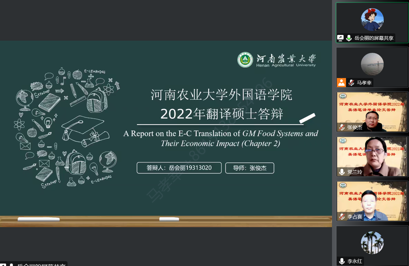 2022届英语笔译专业学位论文答辩通过线上的方式顺利举行。此次答辩特邀华北水利水电大学党兰玲教授担任答辩委员会主席,华南农业大学李占喜教授以及Bet365中文网址