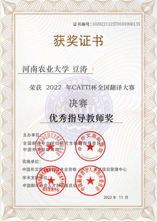 “以赛促教,以赛促学”是Bet365网址 在学科竞赛方面的一贯宗旨。自赛事启动以来,Bet365网址 高度重视,精心组织,从240名农大学子中选拨优秀学生,代表学校参加决赛。经过初赛、复赛和决赛最终Bet365中文网址 3名同学从全国8.1万报名选手中脱颖而出,在大学A组全国决赛中喜获佳绩。其中,2021级MTI学生赵维荣获决赛一等奖,2021级MTI学生邢雯雯、2021级英语二班学生高琰妍荣获决赛三等奖。Bet365网址 教师豆涛获得优秀指导教师。