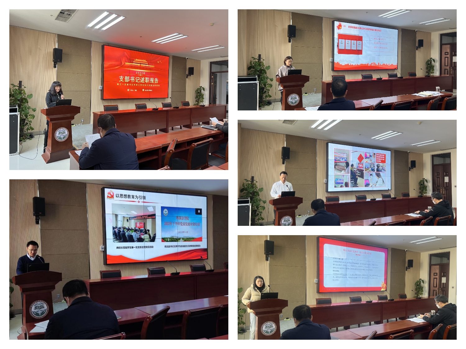 四个教工党支部和一个学生党支部书记围绕加强政治理论学习和思想建设,履行抓基层党建第一责任人职责,推动基层党组织建设,发挥本支部战斗堡垒和党员先锋模范作用、完成重大任务等方面,结合本年度党支部工作开展、特色亮点工作、存在不足及明年支部主要工作计划,逐一进行了述职汇报。