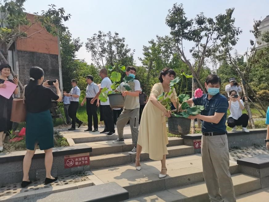 教工代表协同周口校友代表以搬运接力的方式将含苞待放的120盆荷花,安置在学校北湖,至此,捐赠仪式圆满结束。