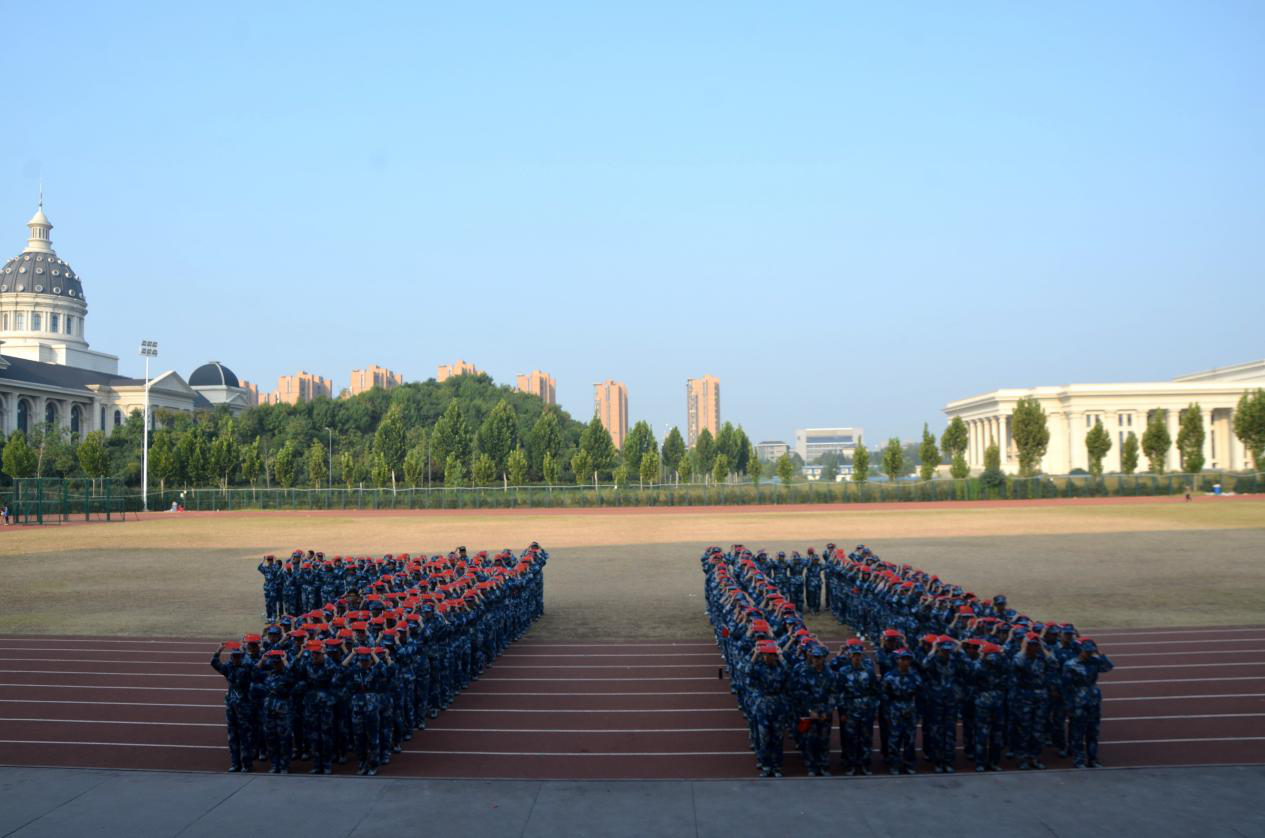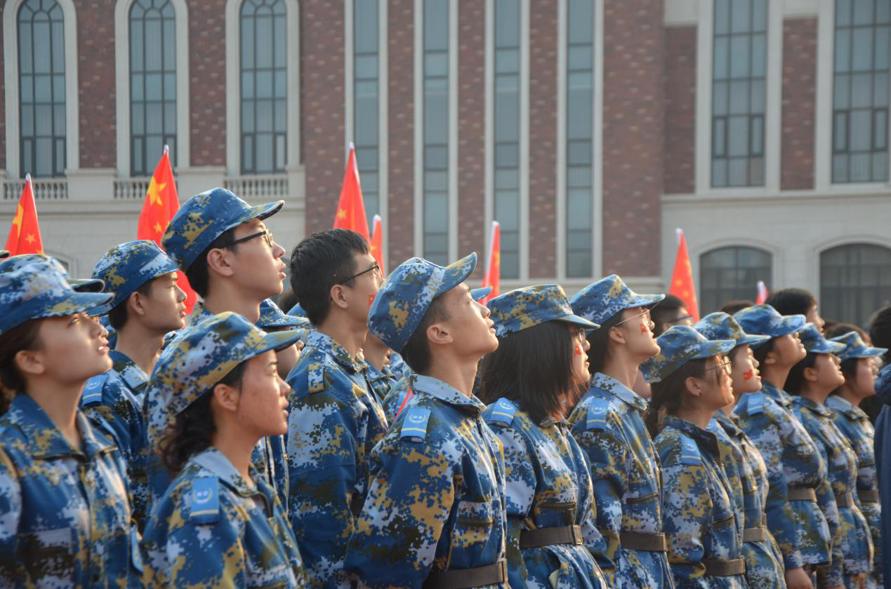 学生于龙子湖校区田径场参与庆祝中华人民共和国成立70周年“庆国庆·升国旗”仪式。