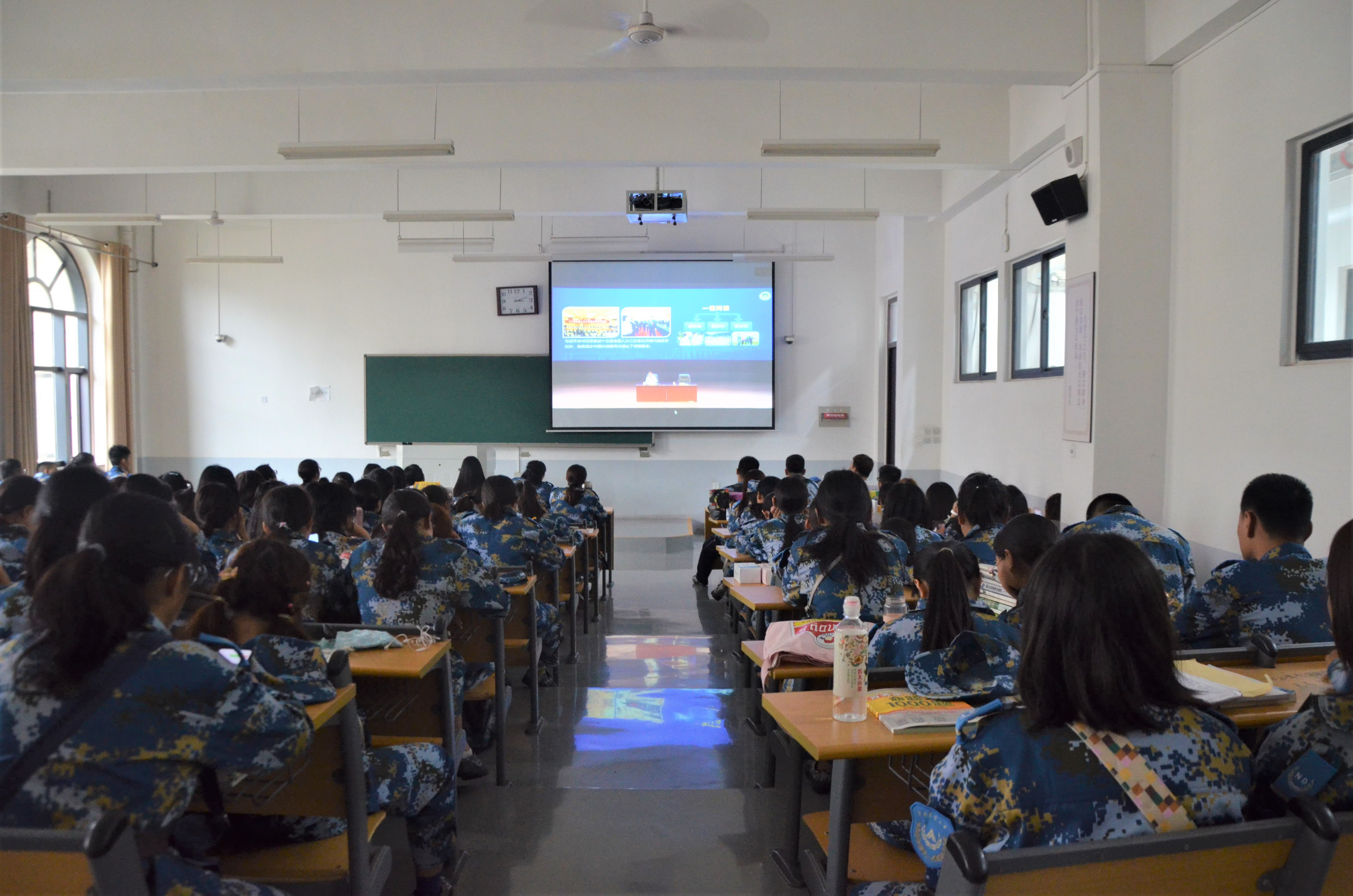 于龙子湖校区繁塔楼D410和D412教室组织2019级新生观看由校党委书记魏蒙关主讲的“大学第一课”实况转播。