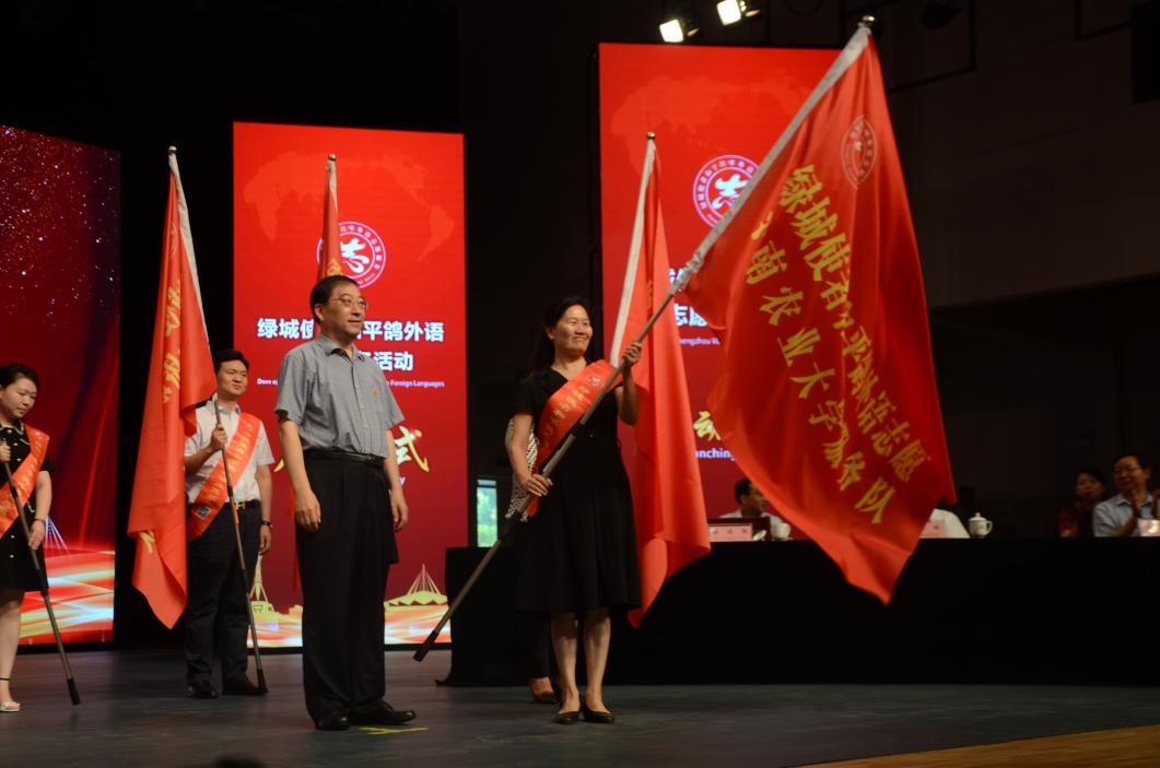 活动由中共郑州市委外事工作委员会办公室主办,以“志愿和平鸽 闪亮国际郑”为主题,旨在贯彻落实《河南省志愿服务条例》,提升服务国际性活动水平,弘扬“奉献、友爱、互助、进步”的志愿者精神。郑州市人大常委会副主任法建强、市政府副市长万正峰等领导嘉宾出席,院长李喜芬教授郑重接过绿城使者和平鸽外语志愿河南农业大学服务队旗帜。