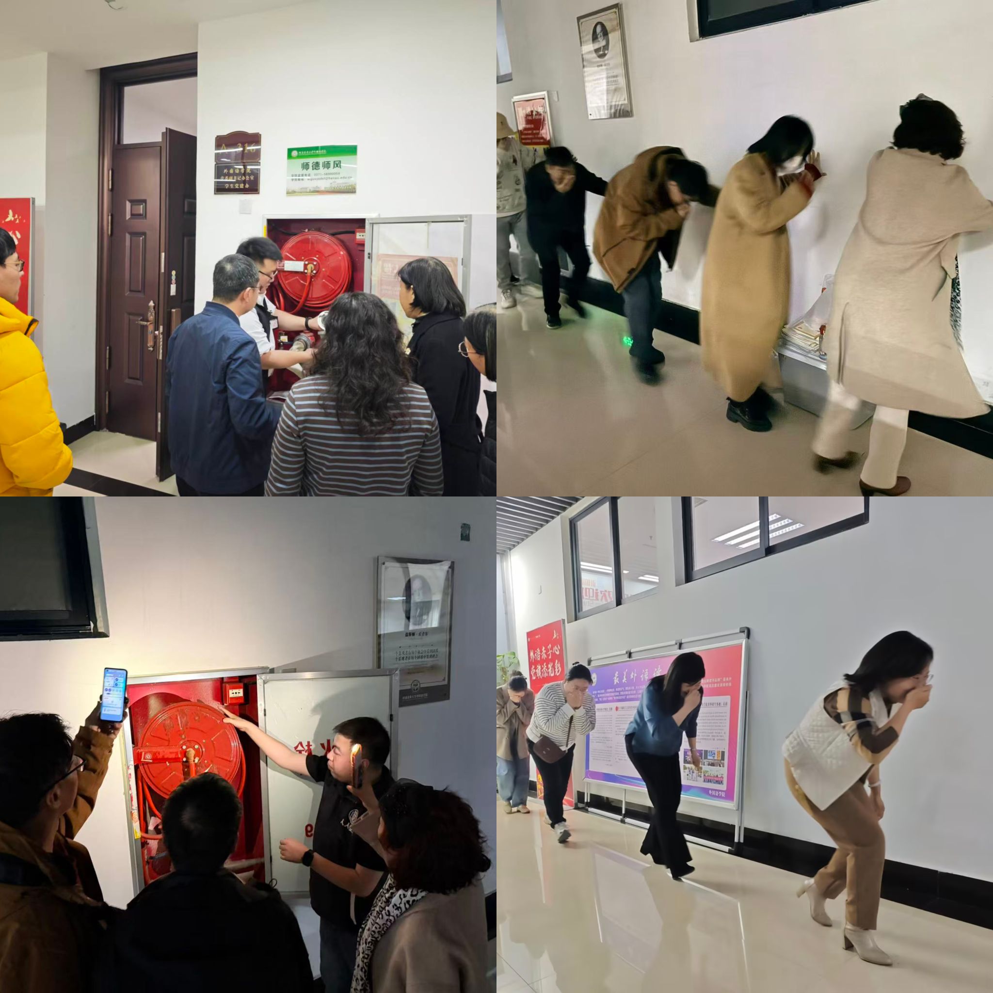 走廊消火栓区域分批次进行。教员打开箱门,详细讲解消防软管、水带、接口、水枪及阀门的安装方法与使用注意事项,并邀请教职工进行实操练习,确保关键时刻“会操作、能应急”。