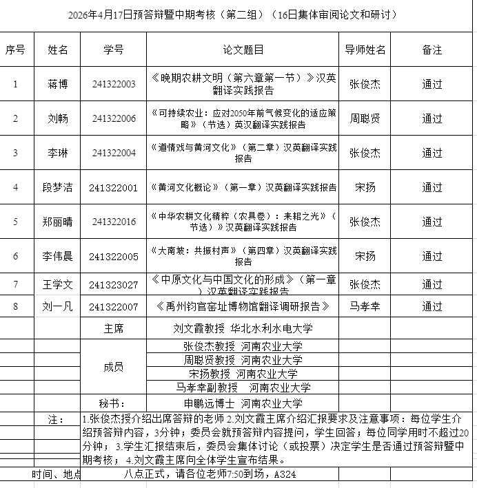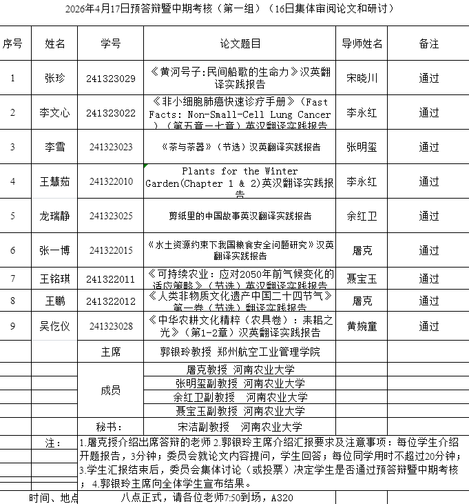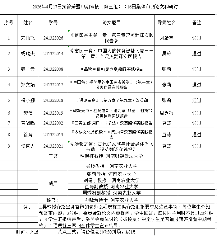 组织开展了2026年英语笔译专业研究生学位论文预答辩暨中期考核论证会。本次论证会特邀华北水利水电大学刘文霞教授、河南财经政法大学毛现桩教授和郑州航空工业管理Bet365网址