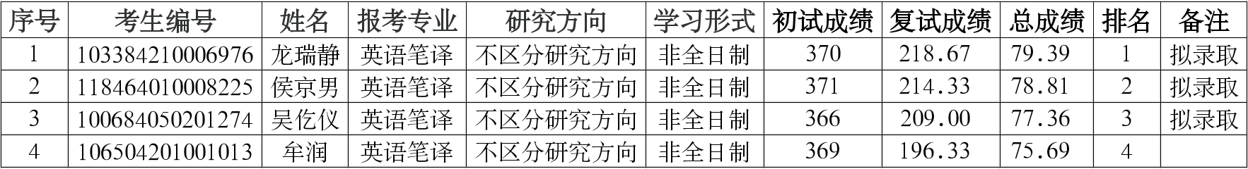 根据学校研究生招生复试工作总体安排,英语笔译非全日制硕士研究生招生计划数增加1人。Bet365网址 2024年英语笔译非全日制硕士研究生招生第二批调剂考生复试录取工作已经结束,Bet365中文网址 第二批调剂志愿复试结果公示如下,公示期至2024年4月21日,请对录取结果进行监督。