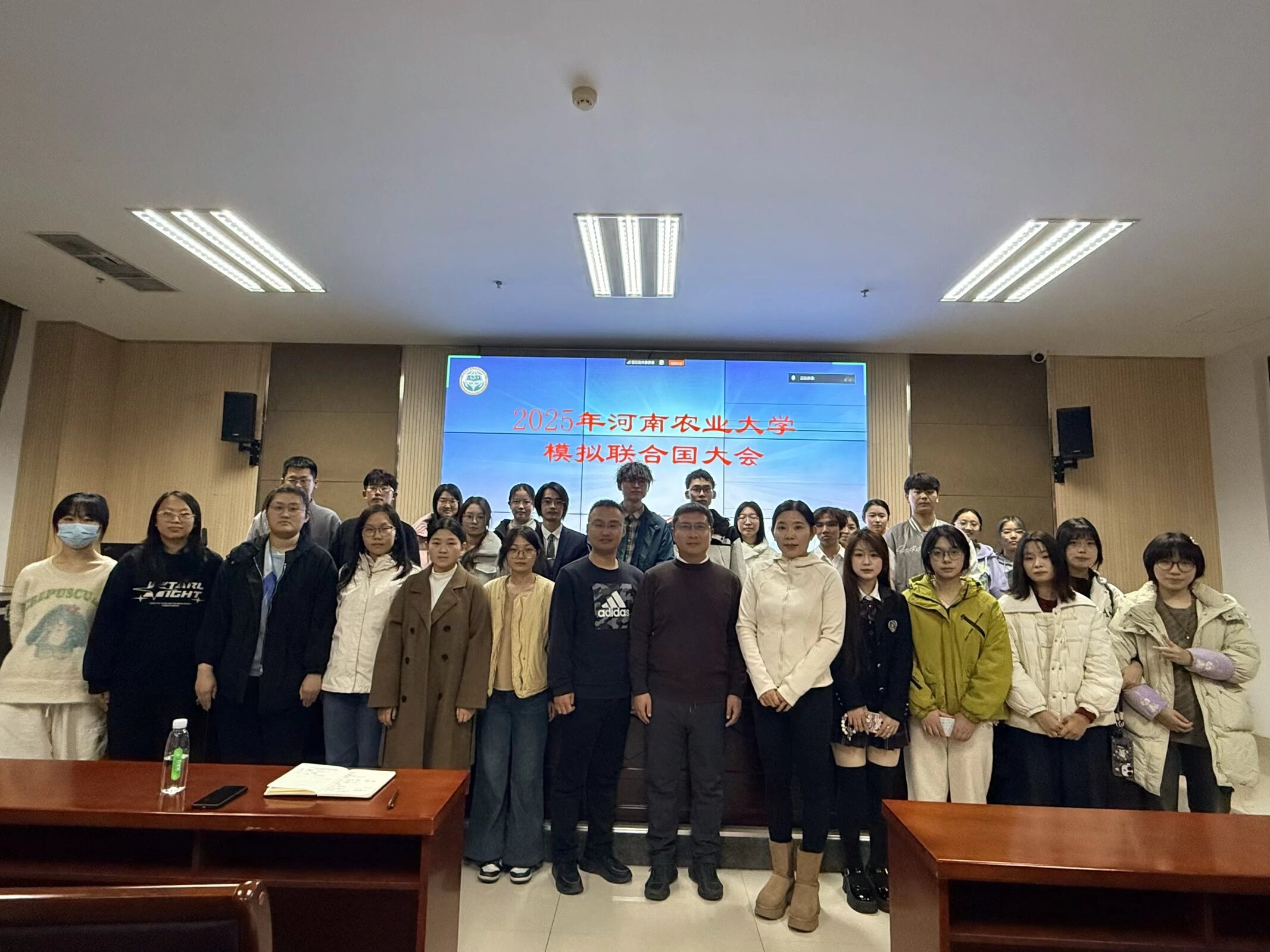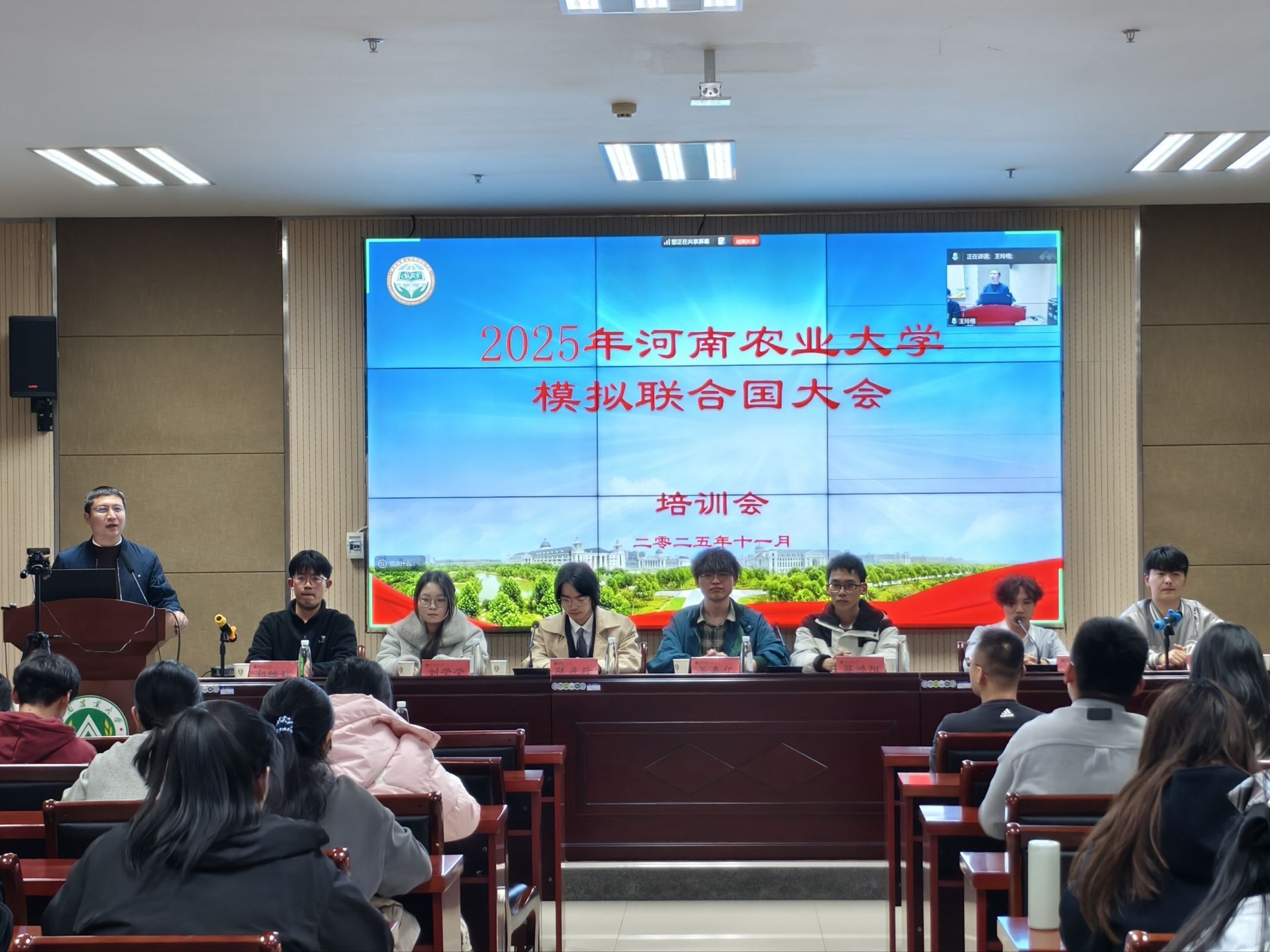 本网讯(审稿:王燕萍 供稿:侯彦冰 单梦梦)为帮助学生提升外语水平与学术素养,锻炼团队沟通能力,拓展国际视野。Bet365网址 邀请河南大学、郑州航空工业管理Bet365网址 模拟联合国社团核心成员,于11月23日晚在繁塔楼A324开展模拟联合国大会交流活动。翻译系、团委相关负责人出席会议,来自全校各Bet365网址 的100余名学生线上线下参加了会议。会议由翻译系主任豆涛主持。