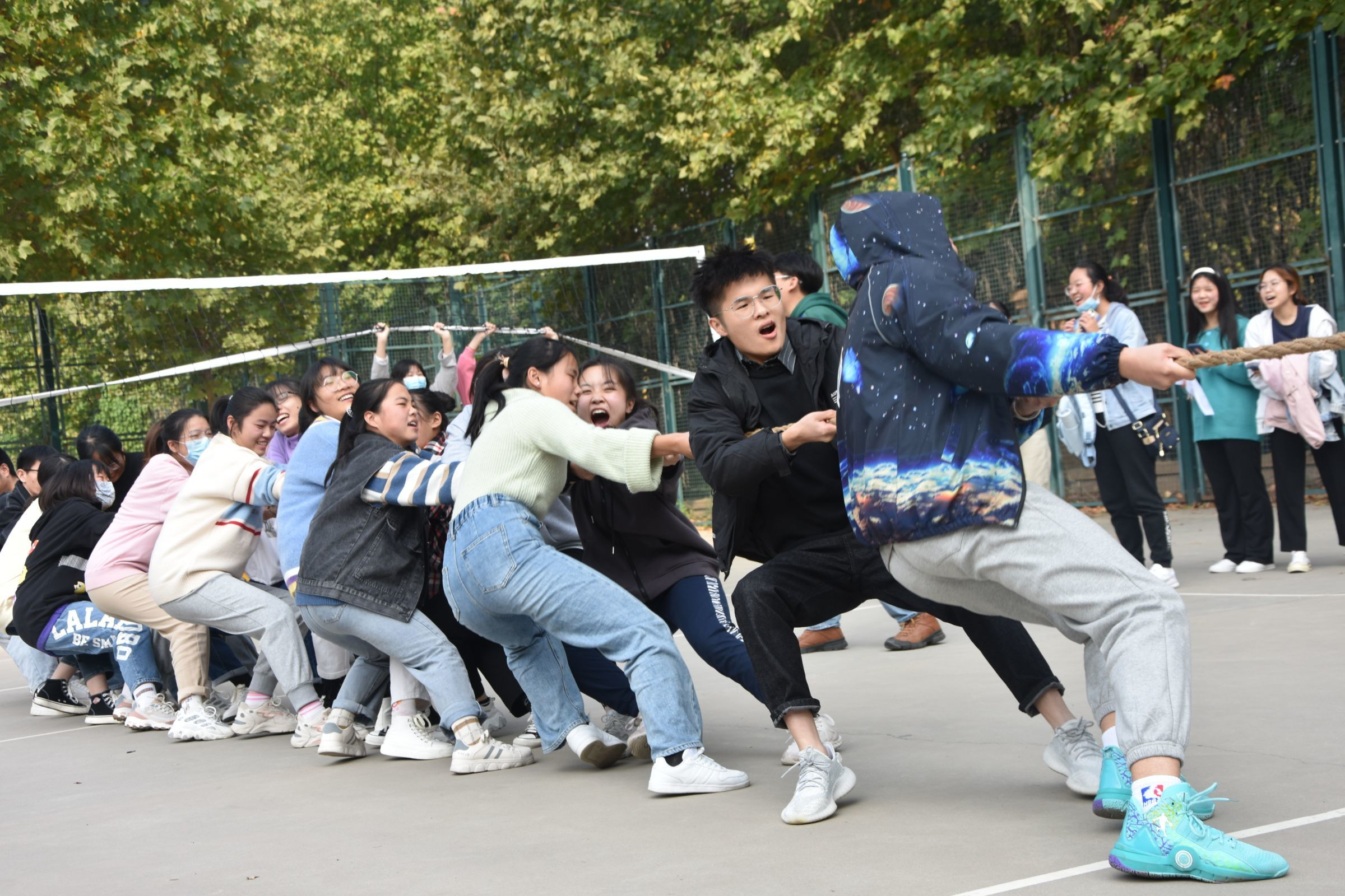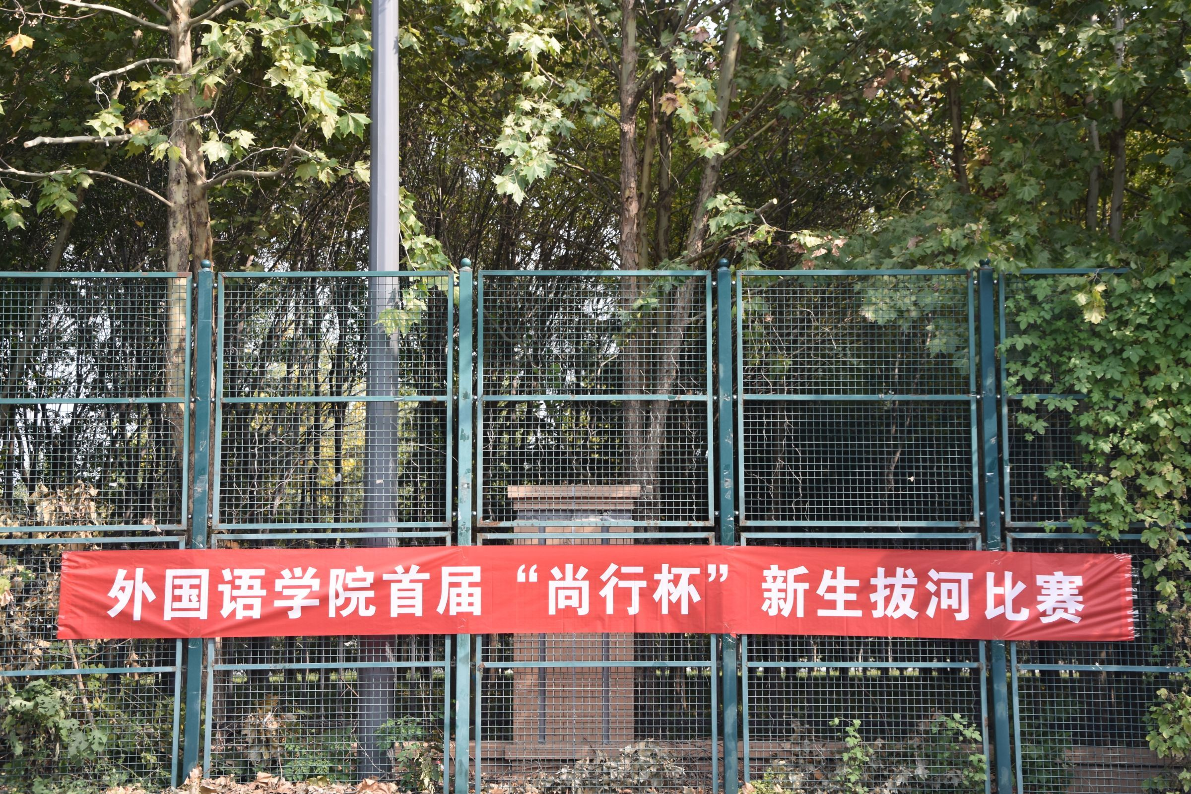 于龙子湖校区排球场举行了第一届“尚行杯”新生拔河比赛。全体新生积极参与此次比赛。