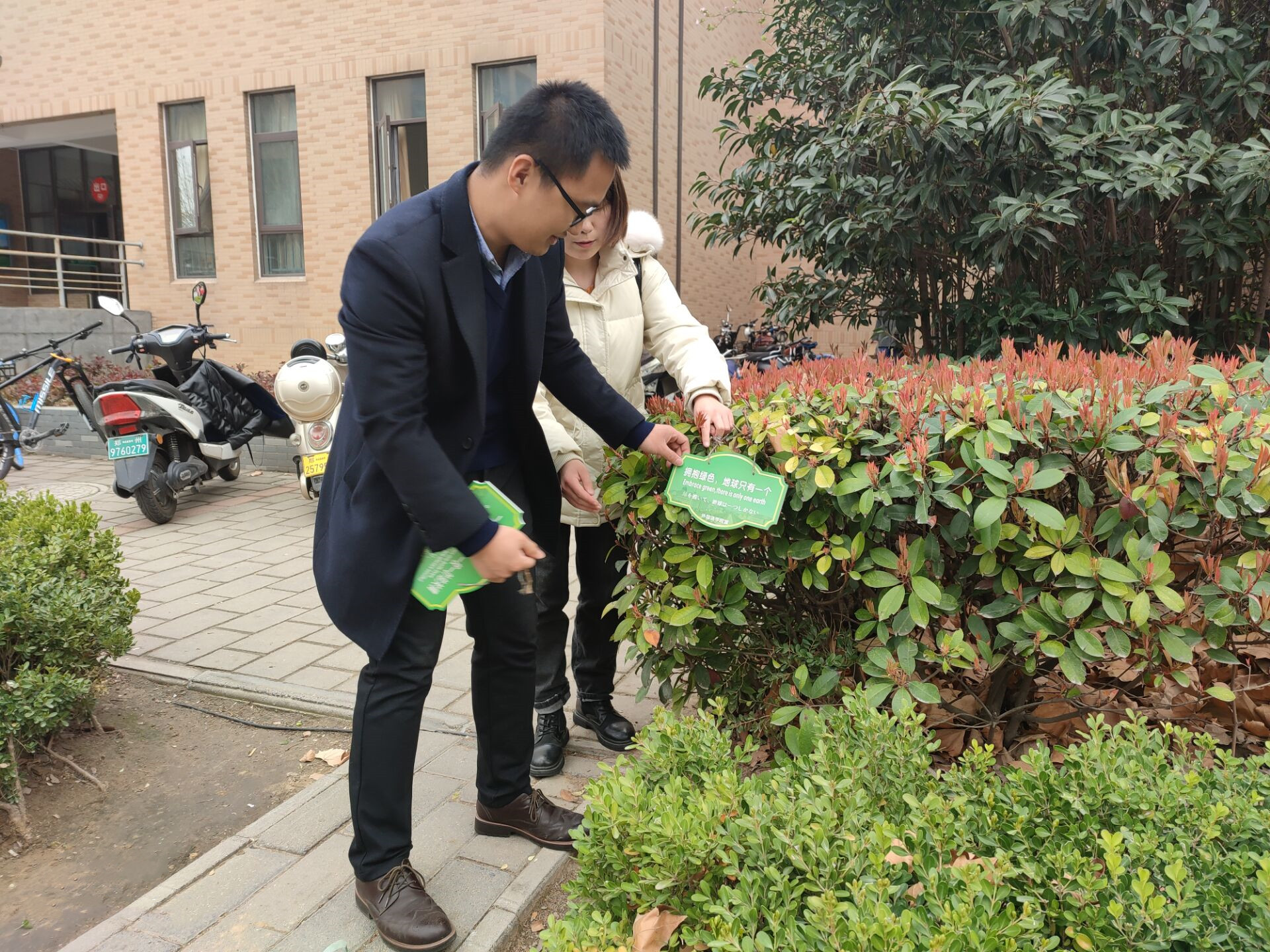 师生一起为校园的树木挂上标语,并科普绿色生活及植树造林的重要性。“举目四顾,芳草遍地”、“Use your love and care to this green space”、“緑色の生命を貯蓄して,緑色の光彩を開放します”等富有Bet365网址