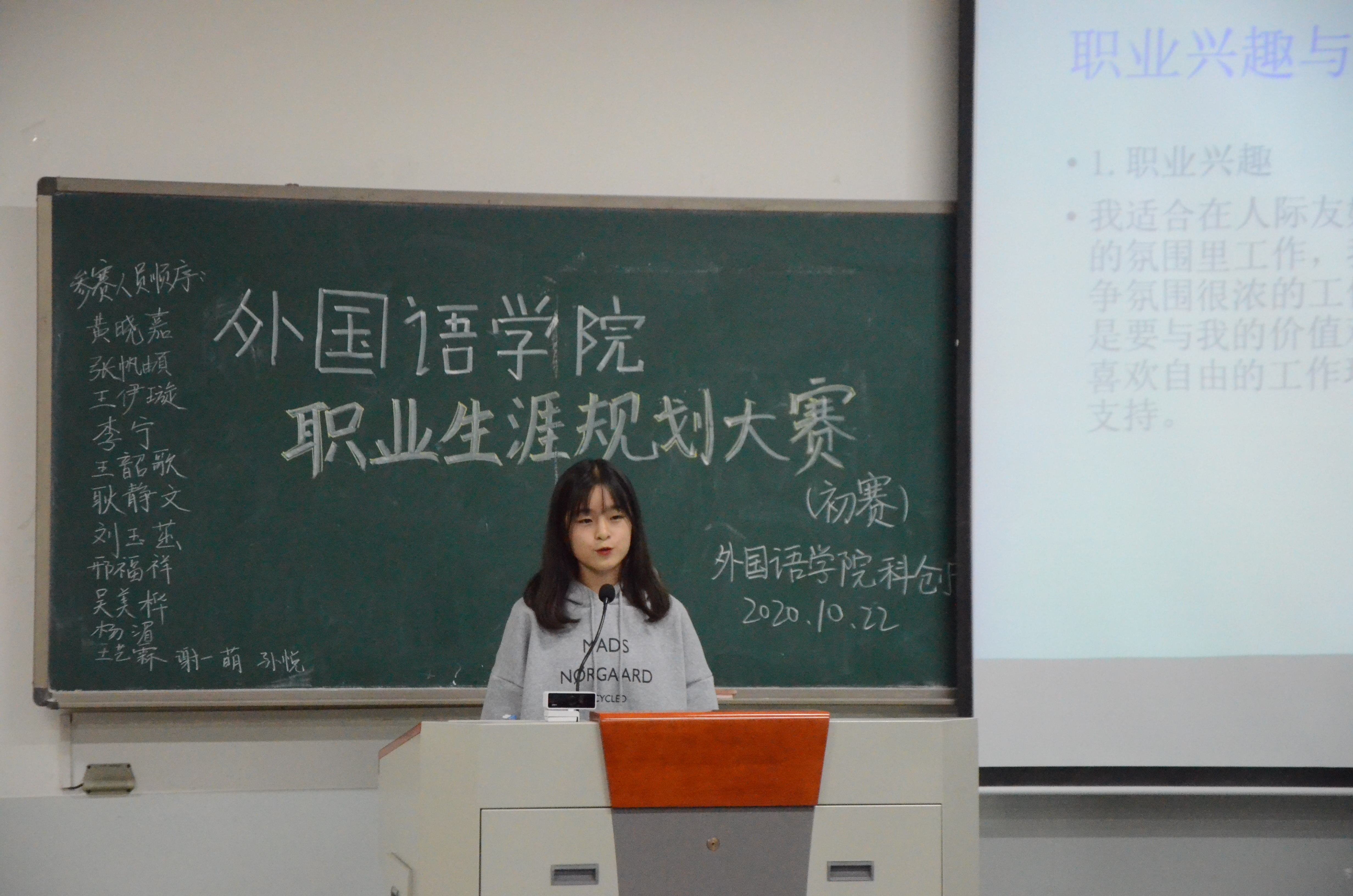赛前,主持人介绍了大赛流程、评分标准等事项后,此次比赛正式开始。各位参赛选手结合自身实际,运用专业知识,以ppt展示的形式从自我认知、职业目标与路径设计、评估与调整、职业道德等6个方面进行了个人职业生涯规划展示。其中,19级英语二班王伊璇提出了“凡事预则立,不预则废”的职业宣言,她以清晰的逻辑、出色的表达给在场观众留下了深刻的印象;20级英语一班吴美烨在催人奋进的歌曲《我的梦》中讲述了自己成为一名高级翻译的梦想,激昂的歌声表达出了她对梦想与未来的信心与决心,赢得了在场观众的阵阵掌声。