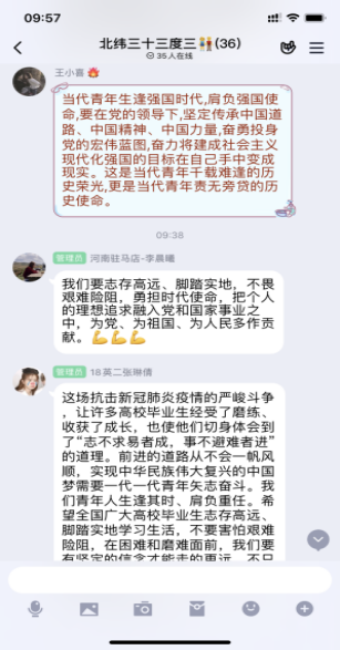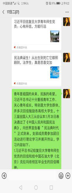 各团支部积极响应号召,有序组织各班同学通过多种形式学习相关内容。首先,各团支部在各班团支书的引导下认真阅读习总书记回信内容,并以支部为单位展开热议。各班同学纷纷表示一定会不忘初心,将个人的理想追求融入党和国家事业之中,用实践践行回信精神;在学习《民法典》相关内容中,同学们通过微信推送等多种渠道获取信息,认识到了《民法典》的重要意义及其在我国社会和人民生活中发挥的重要作用。各团支部亦通过腾讯会议、钉钉、QQ群等平台对所学内容及个人心得进行了交流和分享,支部同学踊跃分享自己的所见所感,并表示会脚踏实地认真学习专业知识,投身祖国建设。