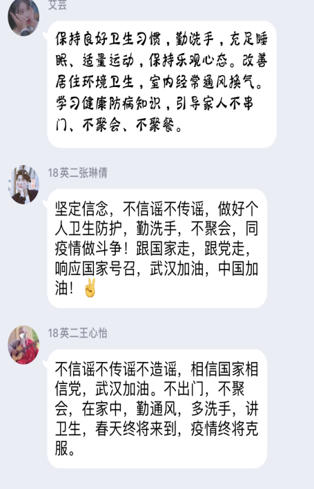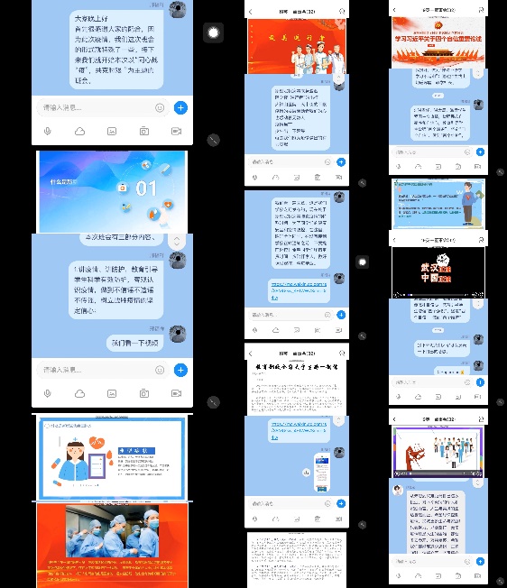 辅导员、班主任以班级为单位,通过QQ群、微信群、网络视频等新媒体手段,认真有序进班开展班会。会议内容包括:一、教育引导学生科学有效防护,理性客观认识疫情。二、强调学校疫情防控有关要求:学生一律不得提前返校、准确报送个人信息、制定合理的学习计划,认真进行线上学习,做到防疫学习两不误。三、引导学生树立责任意识,激发其强烈的爱国主义热情,增强其民族自豪感和自信心,教育引导学生增强“四个意识”、坚定“四个自信”、做到“两个维护”。