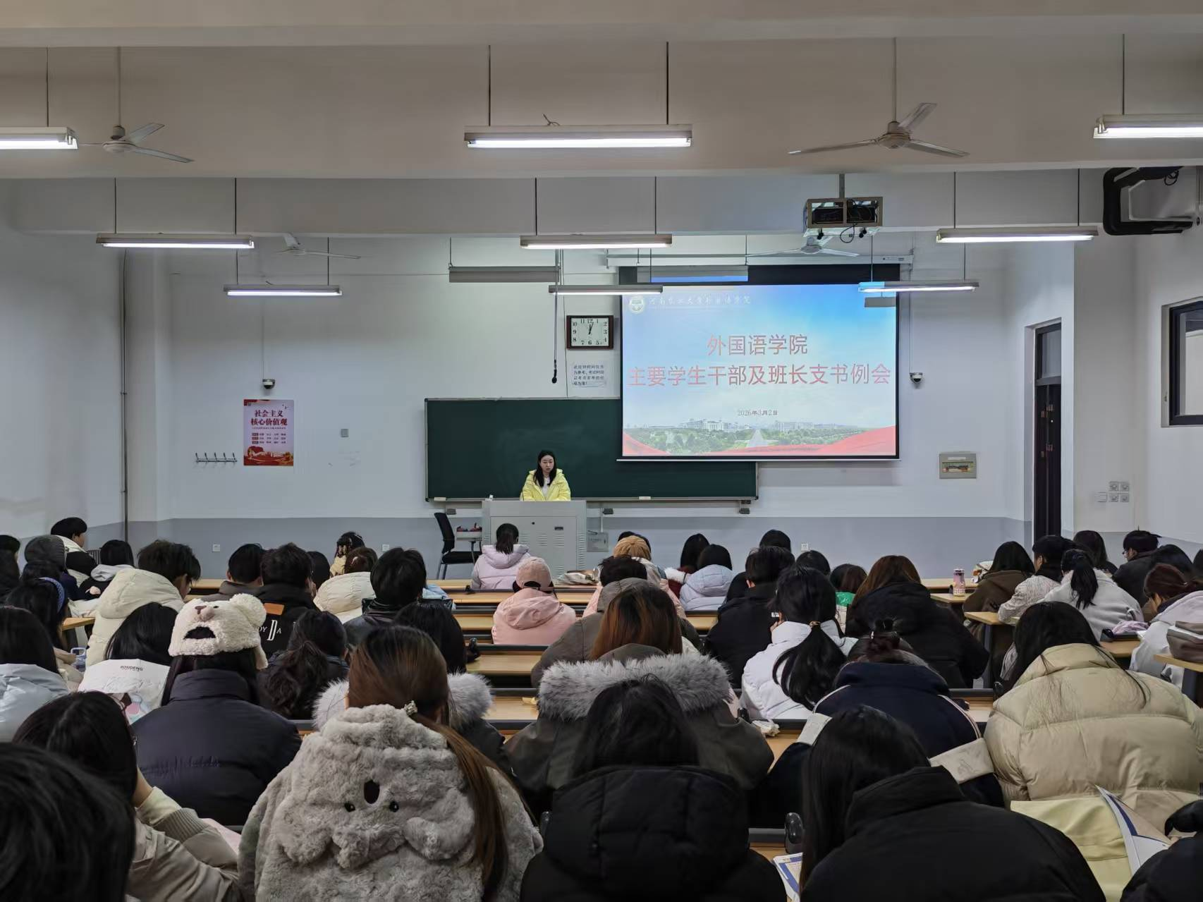 本网讯(审稿:张玥 供稿:侯彦冰 单梦梦)为部署新学期重点工作,进一步强化责任担当,提升学生干部服务意识与履职能力,3月2日中午,Bet365中文网址 于繁塔楼D102召开新学期全体学生干部会议,团委书记李晶、副科级组织员侯彦冰、团委副书记武宗励出席会议,23、24级全体学生干部及班长支书参与会议。